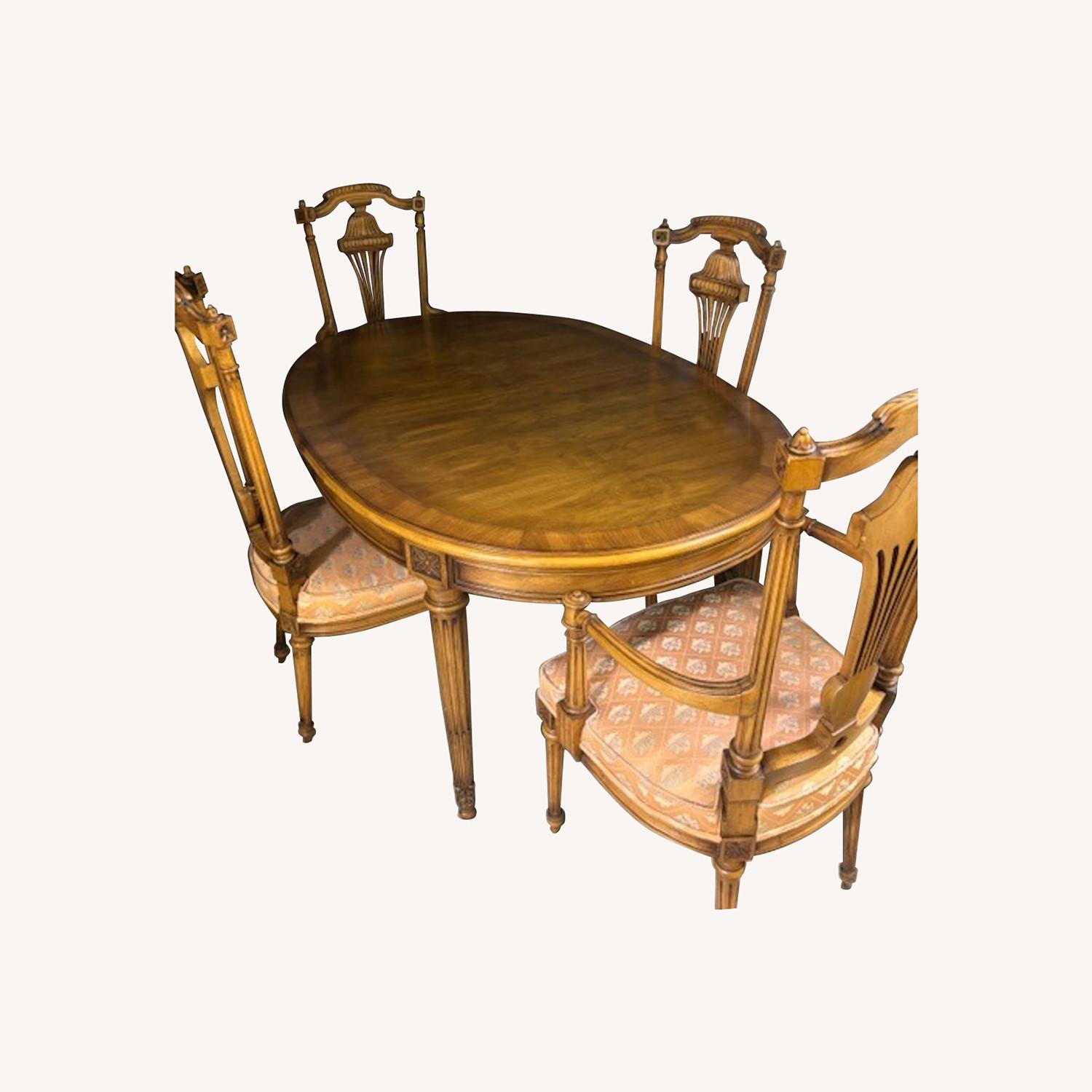 Seller's Notes:Neoclassical–inspired wood dining set—round pedestal table and matching carved-back chairs upholstered in peach-pattern fabric. Sold as a set and does NOT include leaf extender.