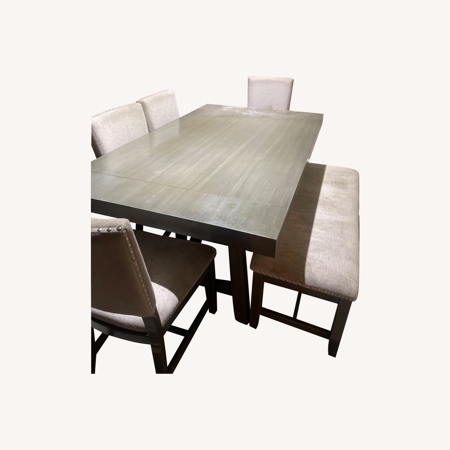 Seller's Notes:6seat dinning table- 7yrs old as listed on photo has stain and worn out table I’ve attempted cleaning chairs with no success. My opinion they are badly stained I tried to get an good picture but the lighting does not justice and I want to be very honest as possible so when item is purchased there’s no surprises.Everything is very sturdy still and I’m sure it still has many years to go if your good at reupholstering and staining table it would look great .