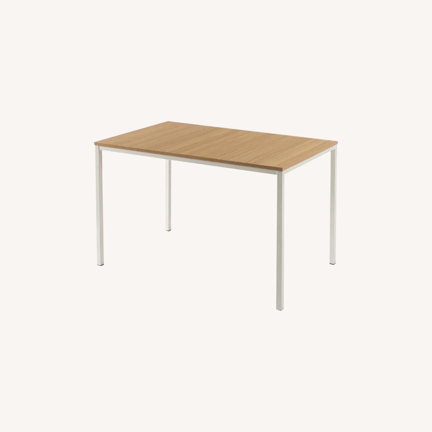 Seller's Notes:This dining table is very sturdy with white steel tubing and a high density surface panel with rich brown wood grain finish. The surface panel is scratch free. It’s in excellent like new condition. Dimensions are 30”W x 48”L x 29”H