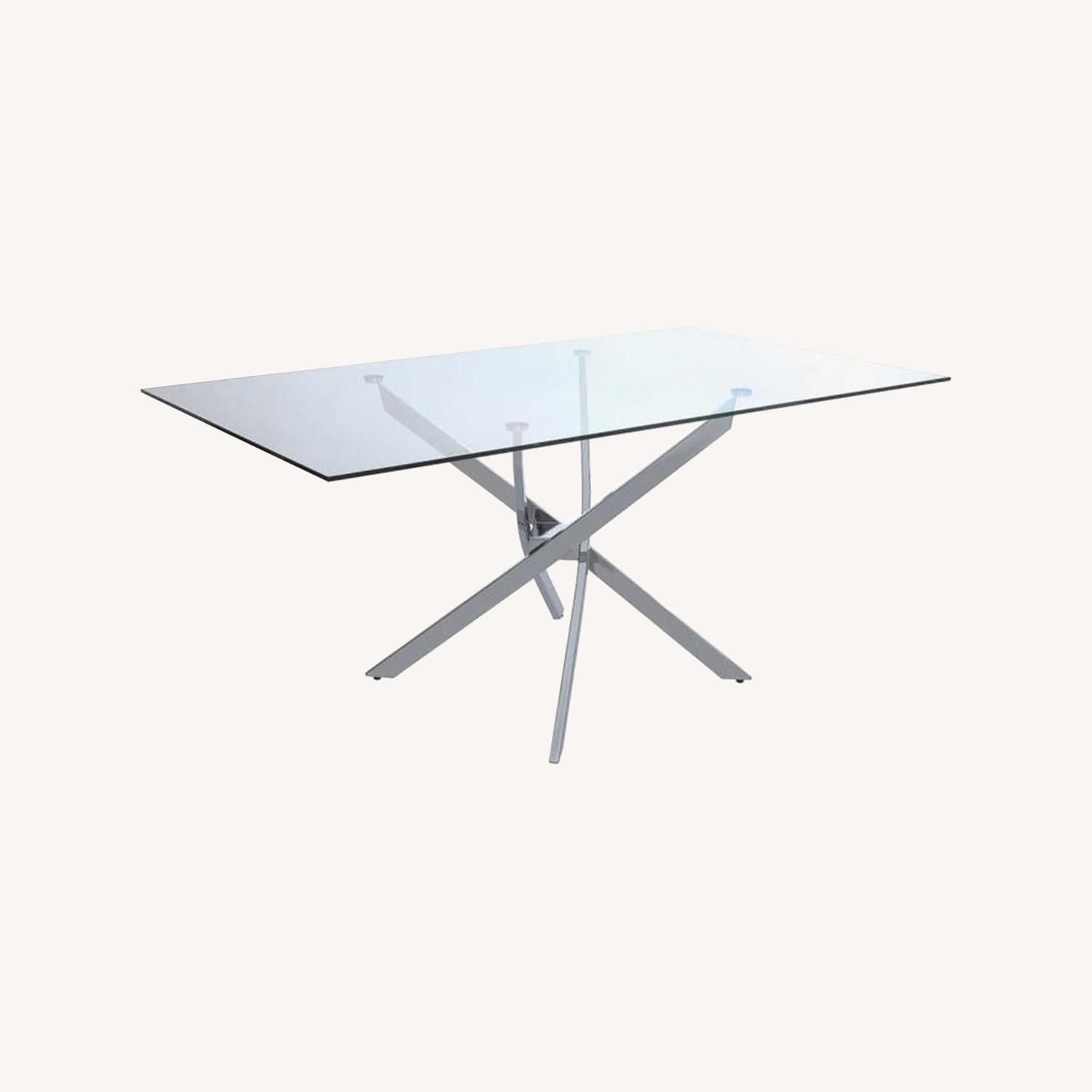 Seller's Notes:Chairs sold separately • Great design can also be very affordable as shown in this contemporary style set • 10m clear tempered glass “floating” on chrome finished metal base shaped like an asterisk • Chair has a futuristic feel with its round tapered chrome legs and upholstered seating in black leatherette
