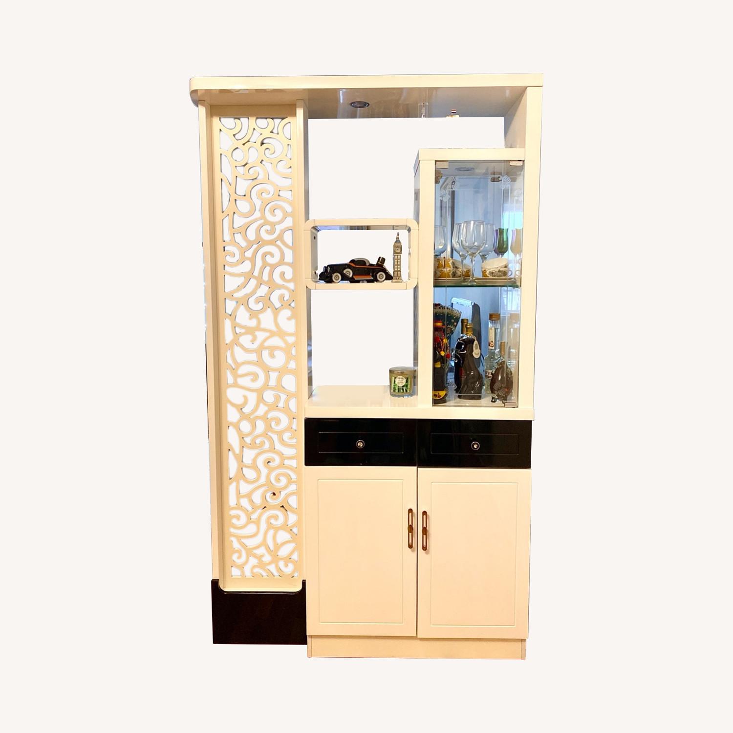 Seller's Notes:This item has only been purchased a year ago but due to a remodel, it will no longer fit in our space. It is a unique solution for dividing rooms with a bar / display case. Perfect condition and great for storage! This is black and white lacquer wood. Beautiful statement piece for any home. Modern & Elegant comes with built in lights to beautifully display your items!