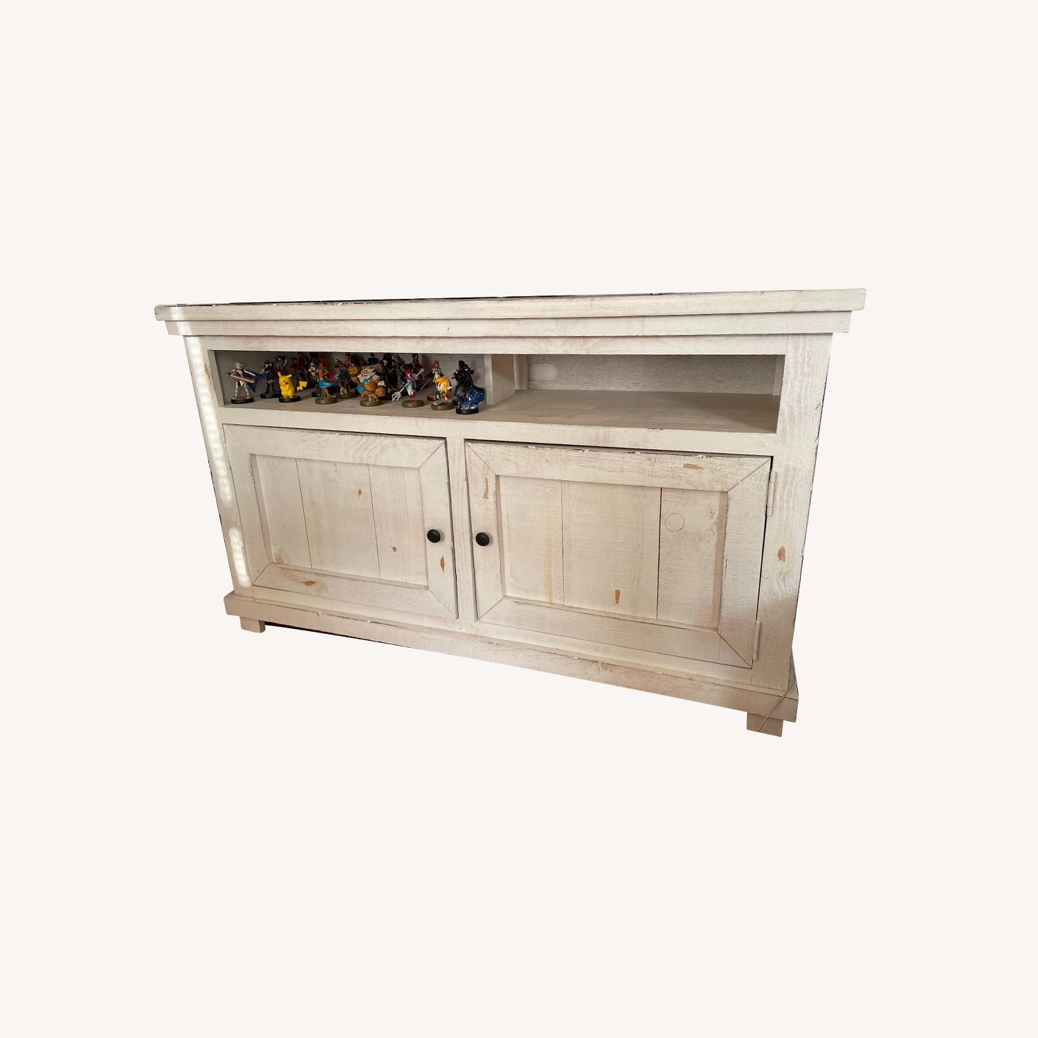 Seller's Notes:This amazing TV stand is so sturdy and reliable. It has tons of storage and it's in incredible condition. The open area is great for displaying items (like our figurines) and the doors offer a great way to hide unsightly items.