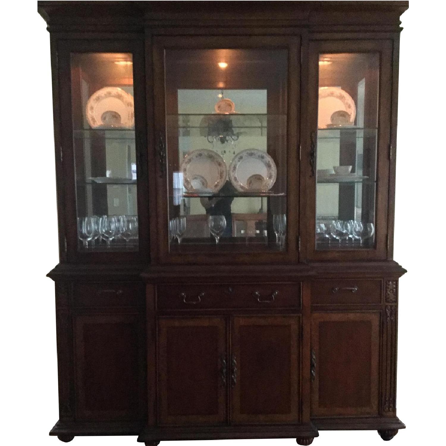 Seller's Notes:Traditional Styling, Intricate Carved details, Asian Hardwood, Cherry and Ash Burl veneers Manchester China Hutch - 69W x 20D x 85H - Beveled glass doors with sensor-activated interior lighting, two drawers, brass hardware carved details. Plenty of bi-level storage behind doors with adjustable shelving, functional drawers. Excellent Condition.
