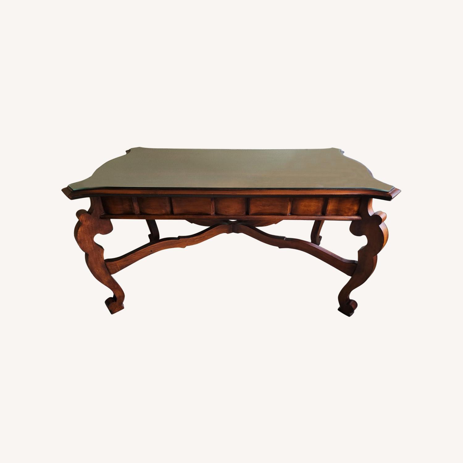 Seller's Notes:This Romweber Spanish Baroque carved pine desk was designed by Jim Peed. The desk has three drawers with a lock on the center drawer with key. The desk has a few issues: small piece of wood missing from bottom of one leg. Small scratches and some small indentations. Two front tips have been broken of and reattached by a professional woodworker. Hard to tell, but some of the finish applied by the woodworker is starting to show wear. Please look at the photos. A custom cut glass top is included. I had this made to help protect the top.