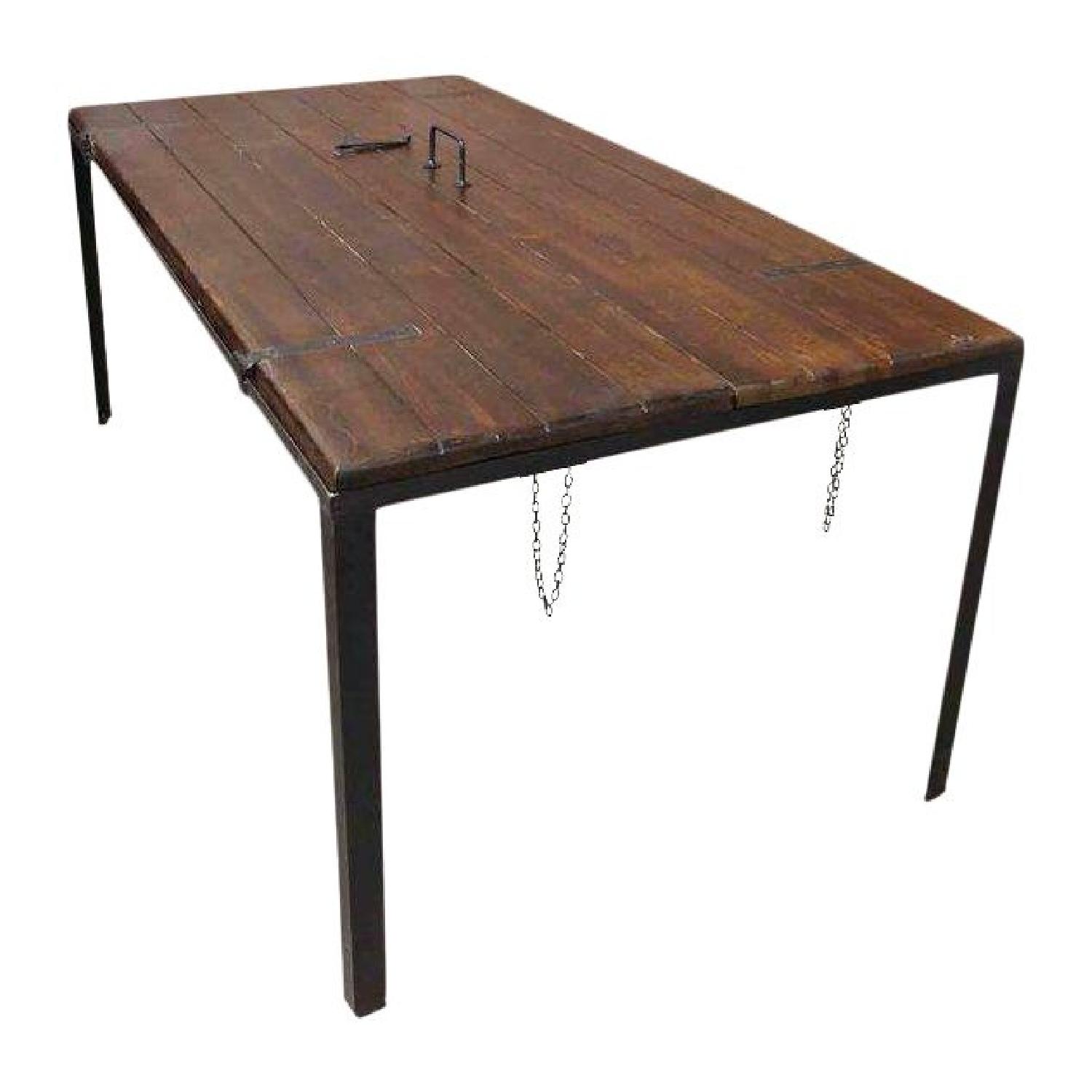 Seller's Notes:This dining table has been converted from a wooden door, complete with handle and latch. Once opened, it doubles as a desk ! On its own, one might describe it as farmhouse rustic. But we have had a modern home and it also stands alone as a strong, subtle statement piece in a modern setting. We have loved this versatile conversation piece but we have moved and now don't have the right amount of space for it. Purchased on Dot & Bo. Note that the door handle is removable if desired. Photos show both with/without it.