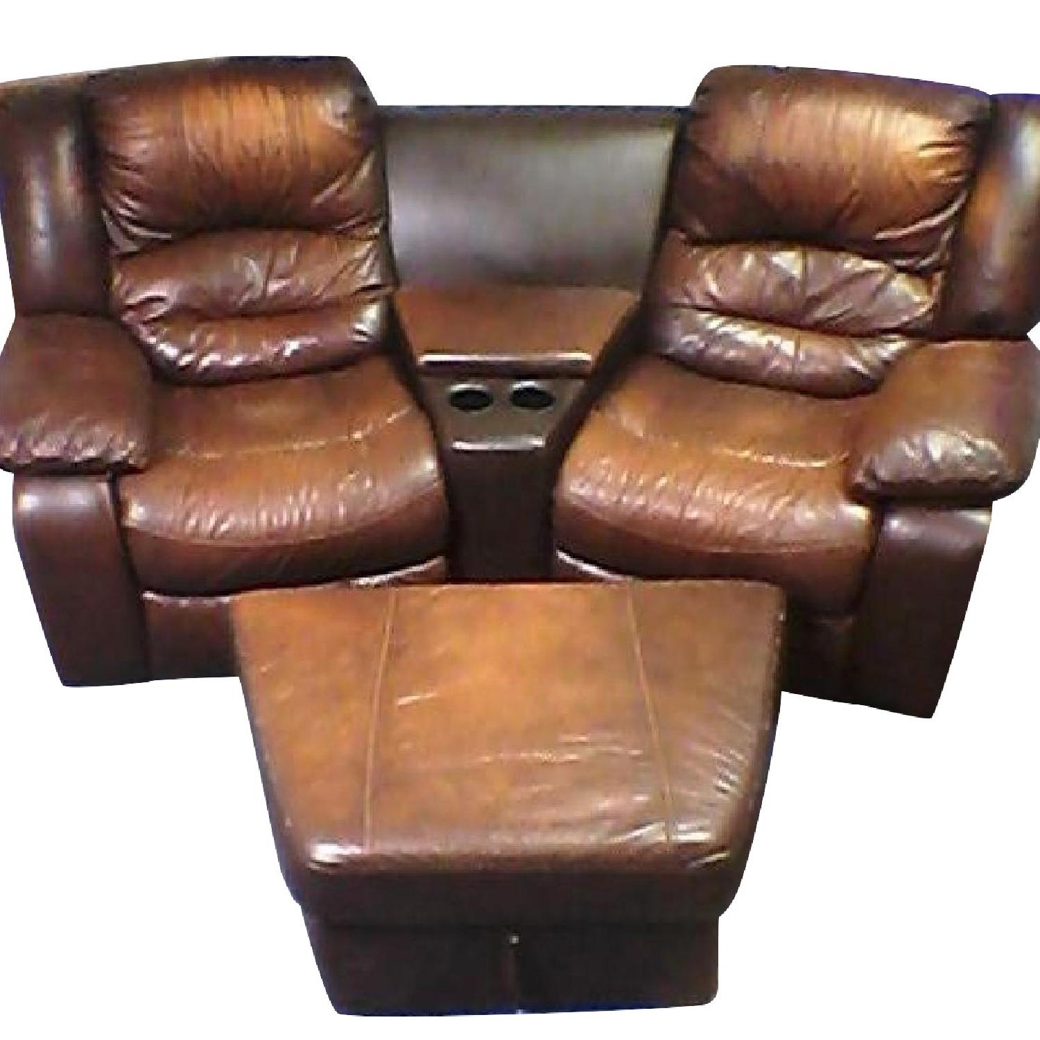 Seller's Notes:Leather recliner home theater set is in almost perfect condition with only a couple wears and tears. There is a small rip underneath the left arm of the left chair, but it is not visible unless you lift the cushion up. The other small rip is on the foot rest of the left chair, but it is also hidden. Extremely comfortable and perfect for a large living room. Comes with: 2x brown leather reclining chairs 1x brown leather center console, with 2x cup-holders and storage area 1x brown leather storage ottoman Dimensions: (width x height x depth) Entire set: 88'' x 38'' x 34'' Each Chair: 34'' x 38'' x 34'' Ottoman: 38'' x 15'' x 24''