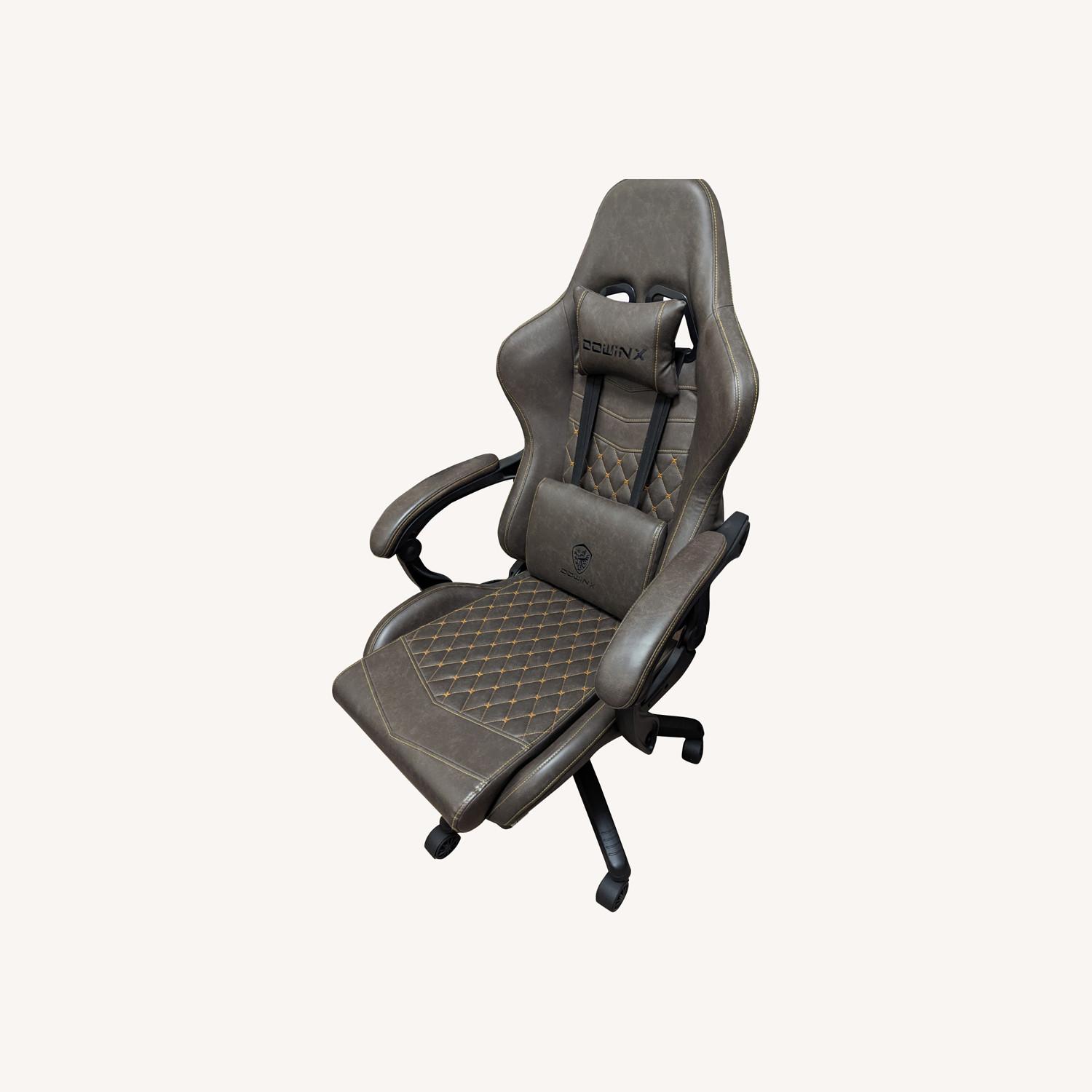 Seller's Notes:Dowinx Gaming Chair Office Desk Chair with Massage Lumbar Support, Vintage Style Task Chair PU Leather E-Sports Gamer Chair with Retractable Footrest (Brown) Product Dimensions: 23"D x 16"W x 20"H Weight Recommended: 110-175 lb (Max weight capacity: 350 lb) Height Recommended: 5'3"-5'13" (Max Height: 5'13") The chair overall is in good condition with a few minor scratches. Everything on chair is functional including the foot rest, reclining functionality and massage lumbar pillow with USB cable (not used at all since time of purchase).