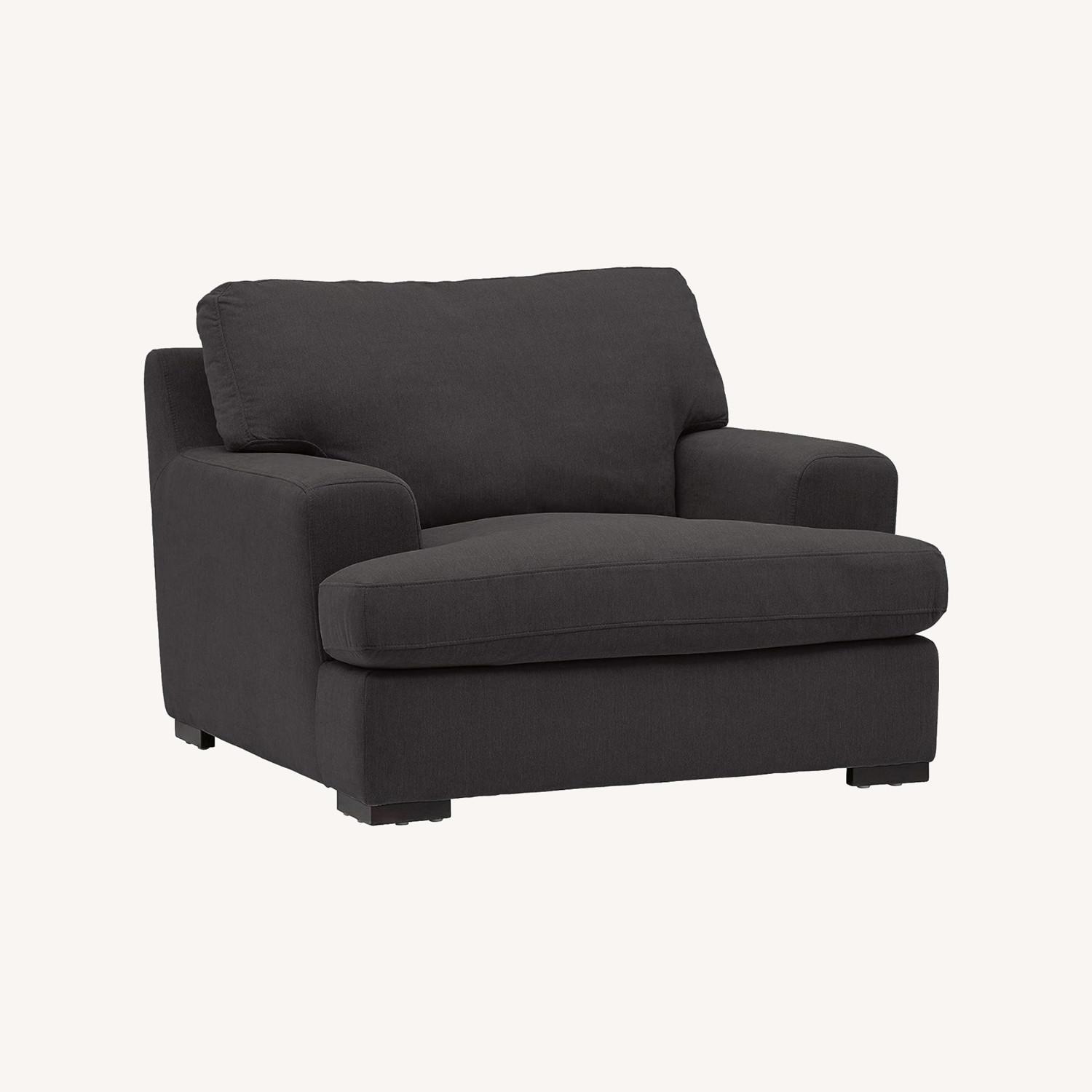 Seller's Notes:This chair is very comfortable and has down-filled cushions. It is also very large, and is very comfortable to lounge in. The black fabric makes it very easy to keep clean. It is only two years old and I am only selling it because I am remodeling to a brighter color scheme.