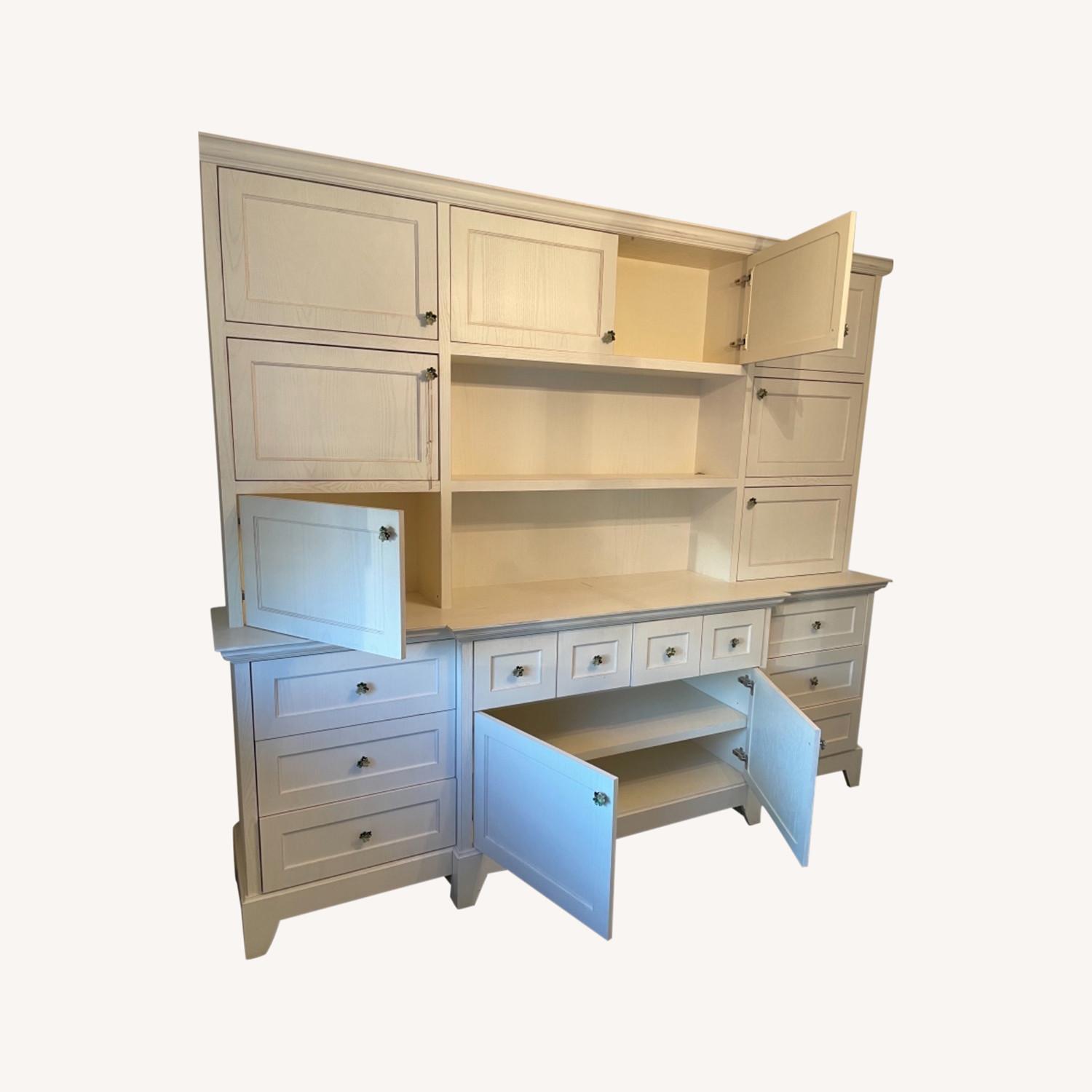 Seller's Notes:Moving sale! Large dresser/hutch. Can be used for many purposes. It is white with delicate flower knobs. It is a very solid, heavy piece. The only marks you can find are on the doors pictured and I’m sure could be easily removed.
