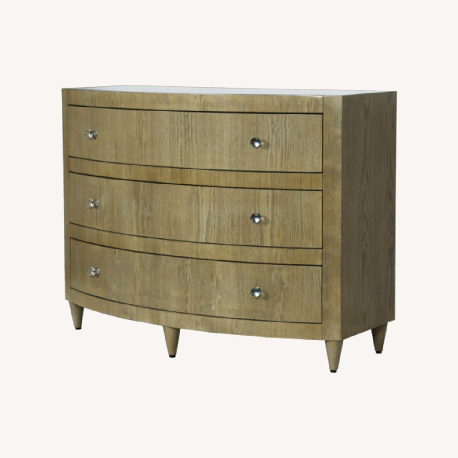 Seller's Notes:Bow front dresser in limed oak finish with inset beveled mirror top. All drawers on glides and clear round glass knobs with nickel detailing. On one drawer of one dresser there is a broken track. We are including 3 new spare tracks that fit this item. This can be used in a bedroom or living room or foyer… 34“h x 45“w x 20“d