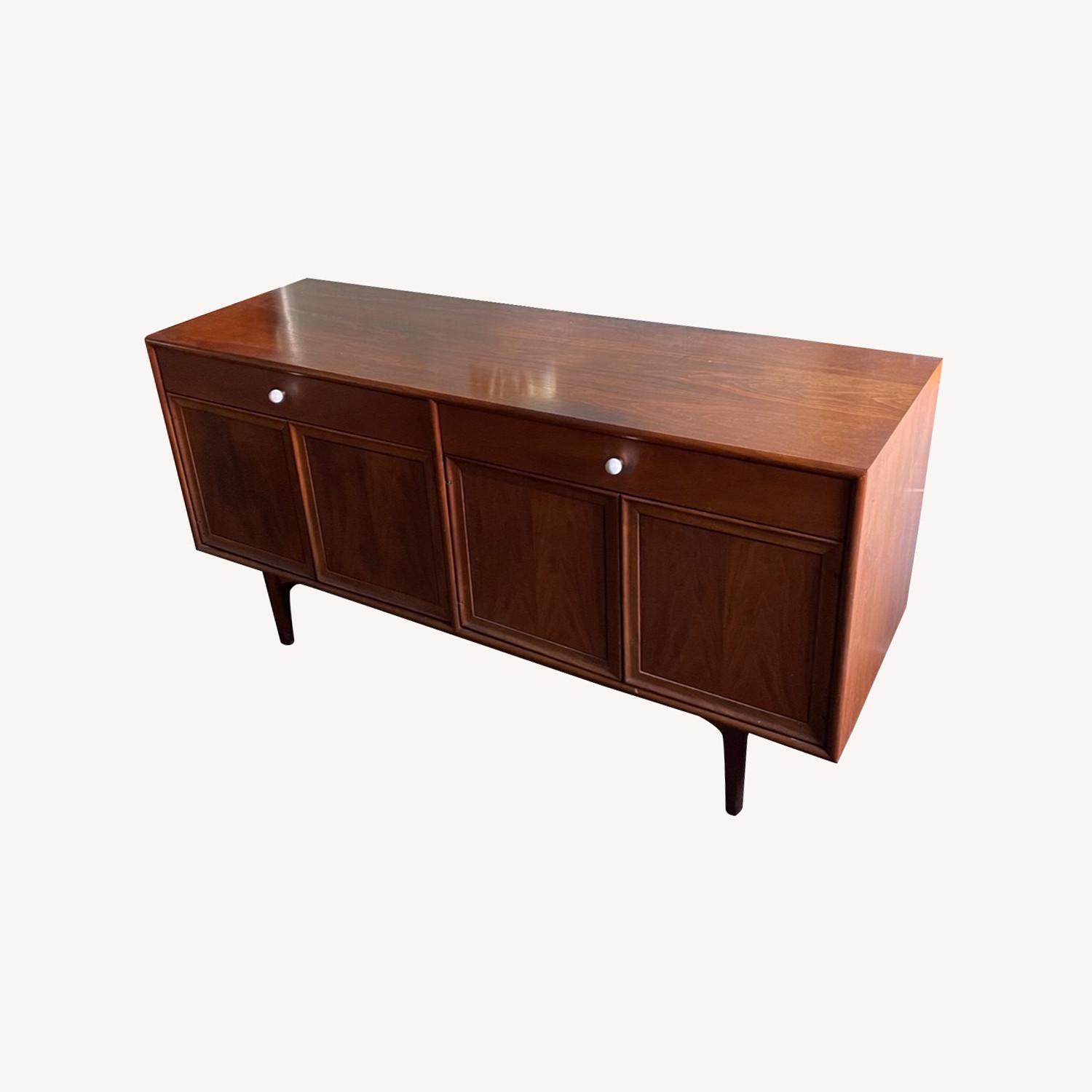 Seller's Notes:1959 walnut record cabinet w interior lighting by DREXEL DECLARATION Original bulbs within 2 bottom cabinet spaces will light your audio equipment and make it easy to read labels. This unit was built with holes in back for electrical chords. Vertical storage for LPs. Drexel is a name in mid century modern furniture. This credenza is part of a line designed by Kipp Stewart. Scuffs, discoloration, imperfections reflected in listed price. Original white knobs. Dimensions: Length 6', Width 20", Height 26 1/2" Dark lettering on back reads: 10/59 851-130-2 Walnut Declaration By Drexel Yellow sticker on back reads: Lot no. MD 023 Piece no. 086 Drexel stamp on interior of top right drawer