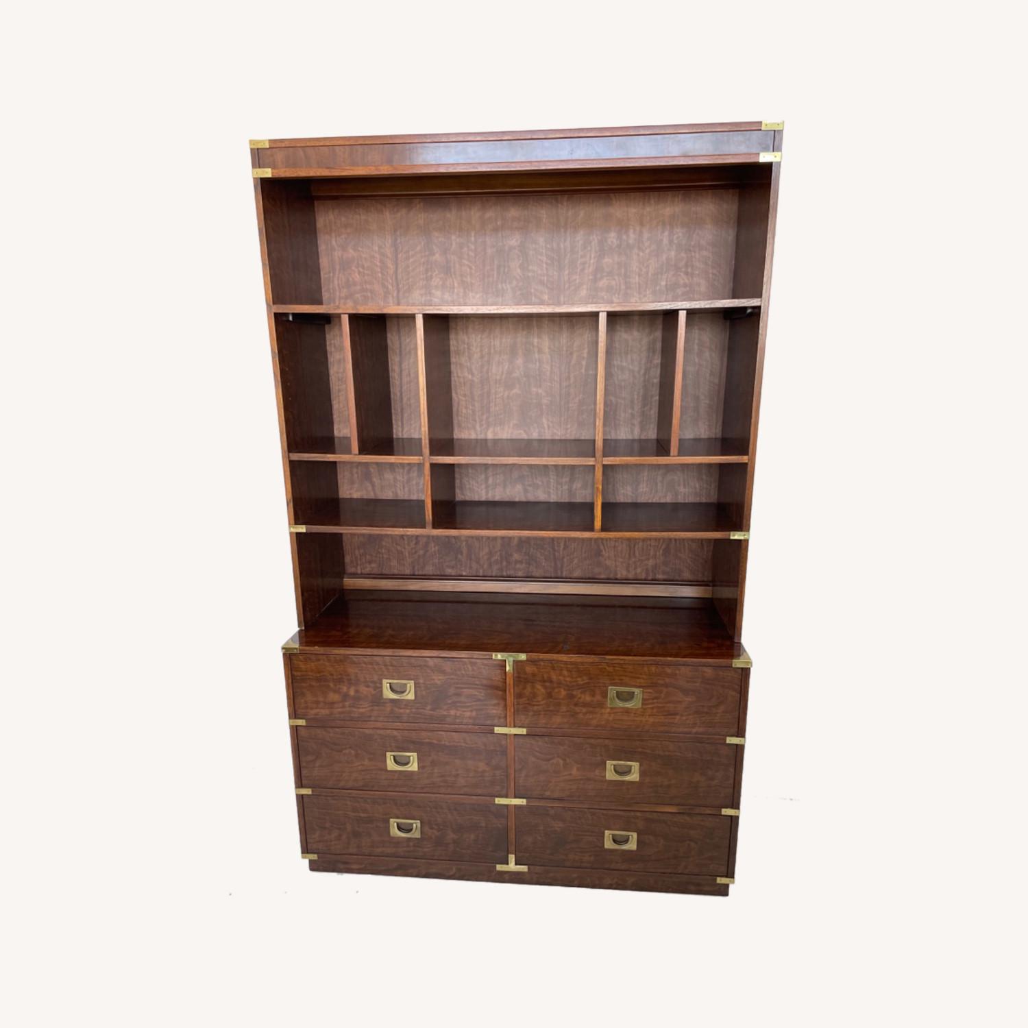 Seller's Notes:~60s era Drexel Brigade 6 drawer dresser with hutch, campaign style, in a lovely burled walnut. They're two separate pieces but are meant to go together. Wear is consistent with age and use, there are a few dark marks on the surface of the dresser, some chips to the veneer throughout, and a streak on the right side of the dresser (all in pictures) but nothing that catches the eye. The back panel of the hutch is slightly peeled up—the first two or three wood staples on either side have loosened, but it doesn't change the structure or look of the piece. All 6 drawers roll well and have dovetail joints.