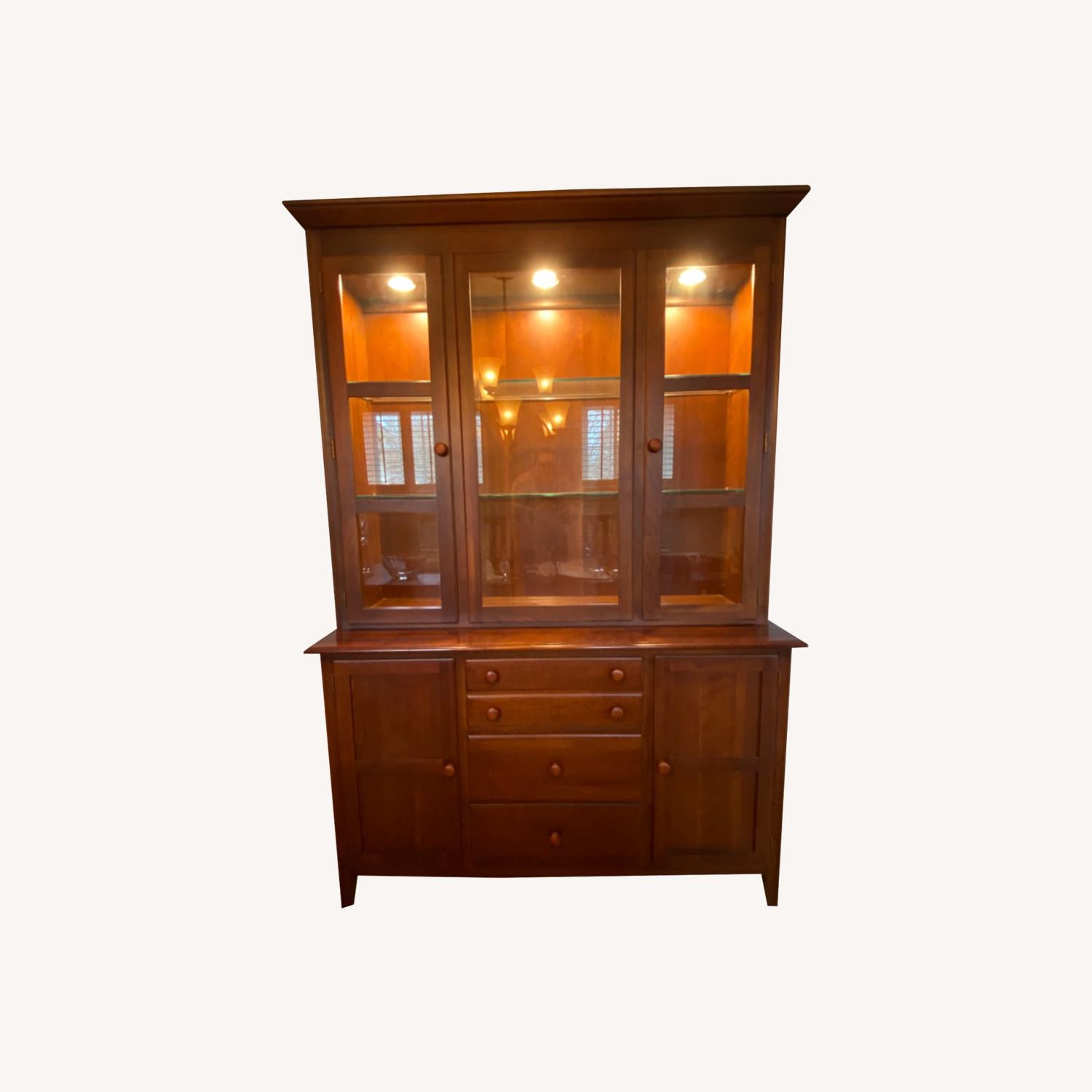 Seller's Notes:Simple farmhouse style Drexel Studio, solid cherry buffet and lighted China cabinet with glass shelves and plate. grooves etched into both the glass and the wooden base. This is in good condition with one minor scratch on the top of the top of the buffet. Purchased from Tom’s Price in Chicago. Sold as a set only. Lower drawers have child safety locks.