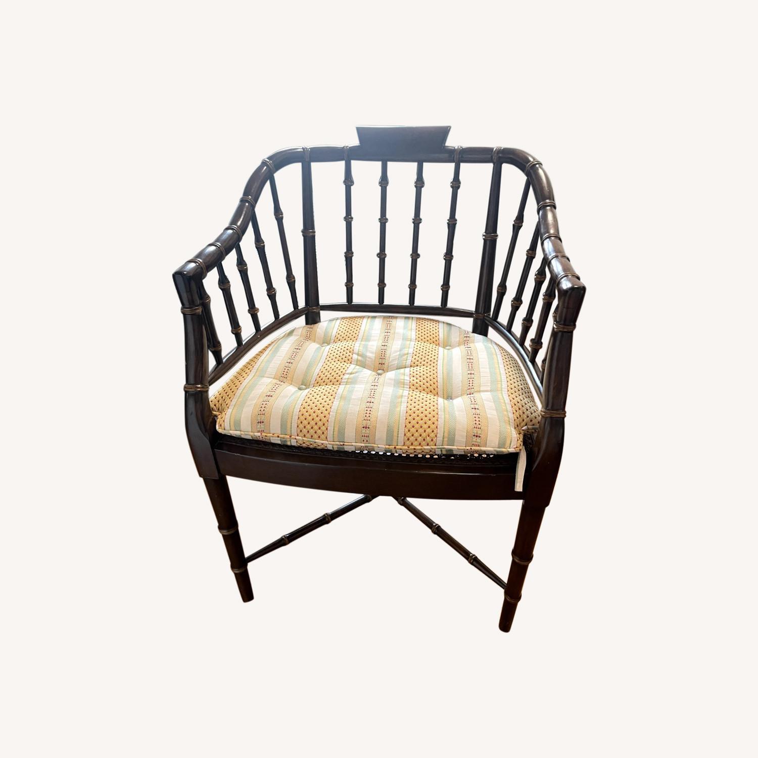 Seller's Notes:1980s Drexel Heritage Campaign Style Regency Faux Bamboo Chairs. In Great condition. Barely Used. Selling the pair for $2000. Individually worth $1200 each. Cushions included free of charge.