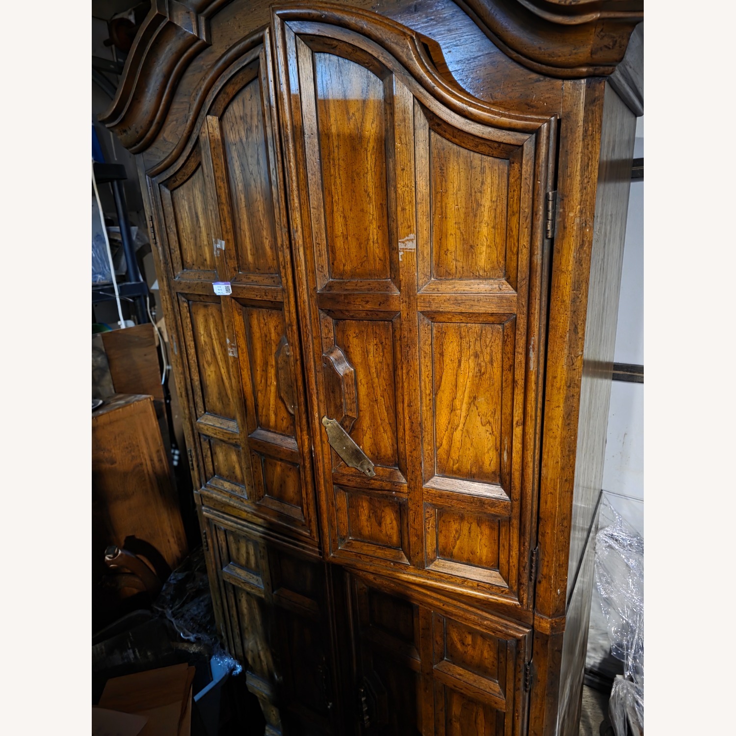 Seller's Notes:Add timeless character and incredible storage to your space with this vintage 1970s armoire by Drexel. Known for their exceptional craftsmanship, Drexel built furniture to last lifetimes, and this piece is a perfect example of that solid, heavy-duty construction. Featuring a beautiful wood grain, classic raised-panel doors, and ornate brass hardware, this armoire brings a touch of traditional elegance to any room. It’s highly versatile and offers excellent organizational space, making it perfect as a wardrobe, a linen closet, a home office organizer, or a statement entryway piece. Key Features: Premium Maker: Genuine vintage 1970s Drexel piece. Solid Construction: Built from beautiful, sturdy solid wood with a rich, warm finish. Versatile Upper Storage: The top section features an elegant arched interior with vertical dividers, creating perfect cubbies for records, books, sweaters, or display items. Spacious Lower Storage: The bottom section conceals a stack of deep, smooth-gliding wooden drawers to keep your space clutter-free. Classic Details: Beautiful raised geometric paneling on the front doors and heavy-duty, decorative brass drop-pull hardware. Condition: Great vintage condition with normal wear consistent with its 1970s age. The wood grain is vibrant, and the doors and drawers operate smoothly. (NOTE: Missing 1 pull and plate.) Dimensions: (78.5 in Height x 38 in Width x 18 in Depth)