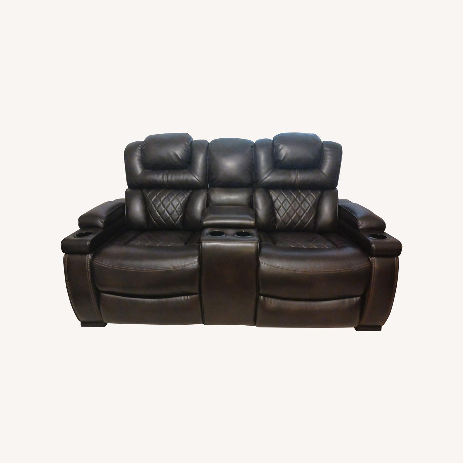 Seller's Notes:Your modern living room awaits this power dual-sided reclining loveseat. Complete with practical faux leather upholstery, one-touch power controls, adjustable headrests and USB ports, it makes finding the best seat for the home theater. Cup holders and a storage console keep drinks, snacks and remotes close by. G Dual-sided recliner One-touch power controls with adjustable positions Attached cushions Power adjustable headrests Each armrest with flip-top storage and cup holder Center storage console with 2 cup holders USB charging port in power control Faux leather upholstery Power cord included; UL Listed