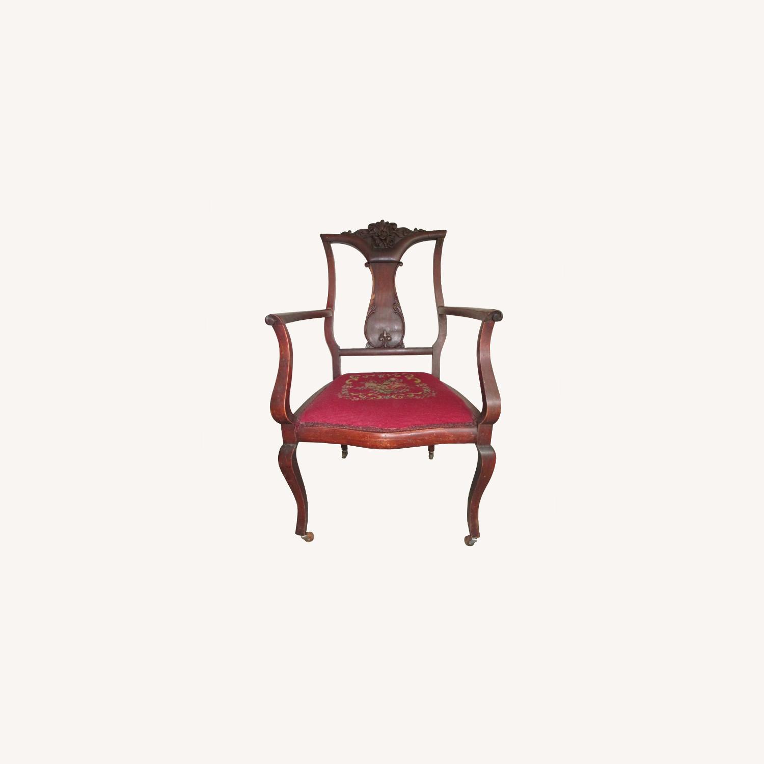 Seller's Notes:This chair was in the same family for at least a century, and appears to date to the 19th century. It was referred to, in the family, as "the Chippendale chair," but the style is much more Duncan Phyfe than Chippendale. This chair is for decoration, not for sitting in. It is too delicate to hold a person of normal weight. There is a piece of veneer that separated from the front of the chair's seat back; you can glue it back on, but (as shown in the photos) a small piece of it is missing and so there will be a small gap in the veneer even after you glue this piece back on. A number of cracks have previously been repaired. The stuffing is sagging from the underside of the seat as shown in the photos, and this produces a dip in the needlepoint surface of the seat. It has cracks, scrapes, and imperfections that are unsurprising in a chair of its age. Thus it is available at a price far below what a Duncan Phyfe chair would ordinarily command.