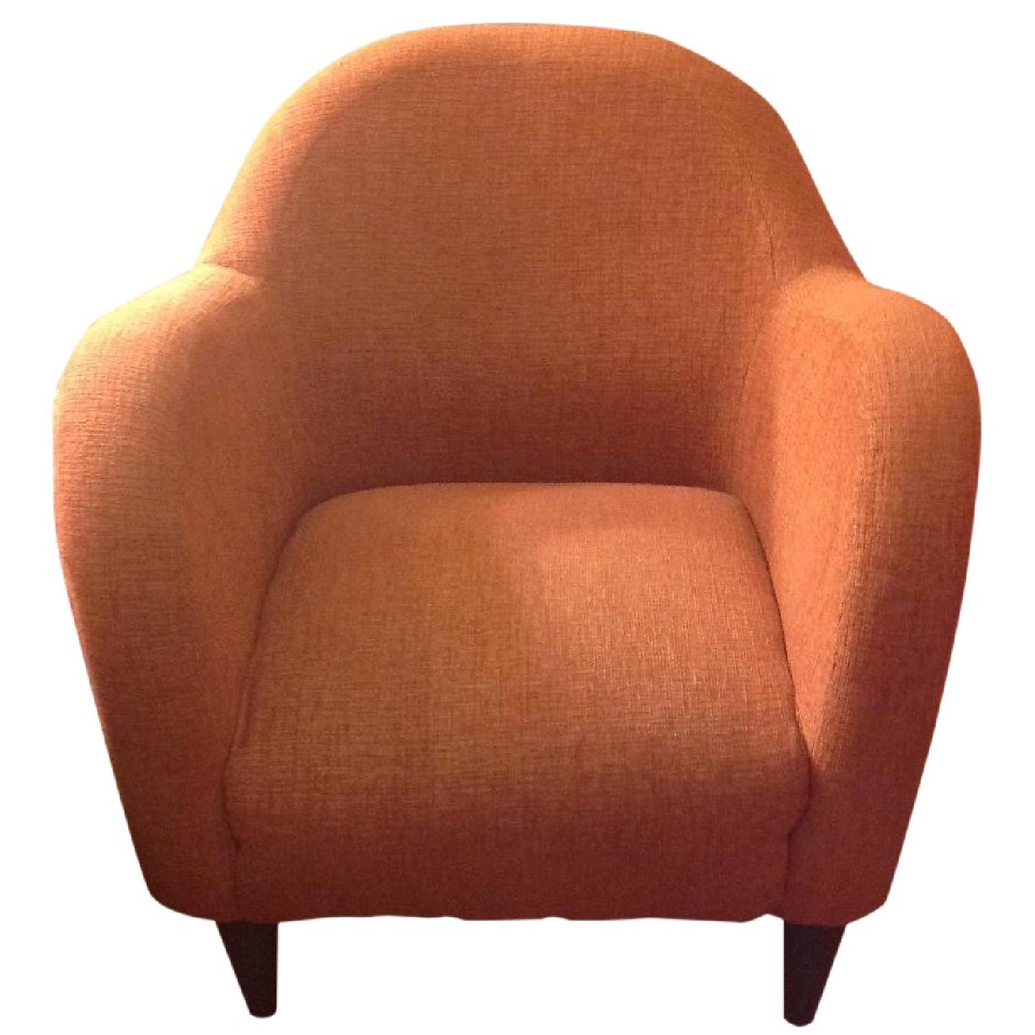 Seller's Notes:Comfortable armchair, is surprisingly light and easy to move. Dark wooden peg legs. Dusty Coral color.