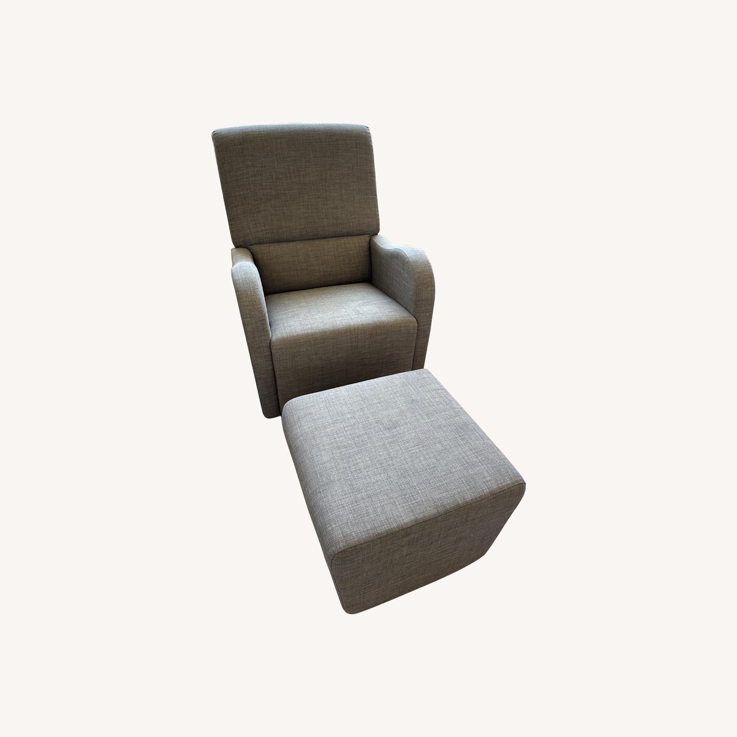Seller's Notes:Dutailier Nursing Glider in light grey fabric, comes with ottoman. Some unnoticeable discoloration, otherwise in great condition.