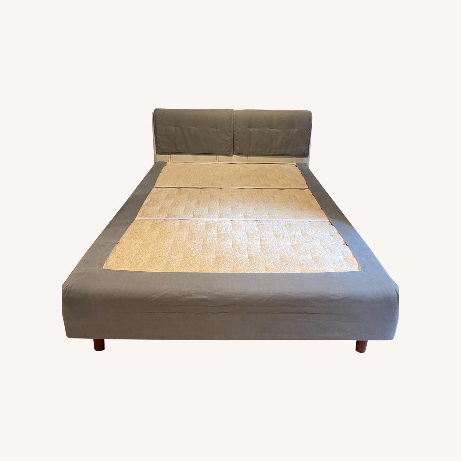 Seller's Notes:This is a fantastic Duxiana Queen Size Bed which has been with me for several years. This bed features a leather headboard with two adjustable headers. The bed is in good condition with some minor stains due to moving on the integrated box spring mattress. The Duxiana bed & technology requires a topper which you can purchase new from Duxiana.