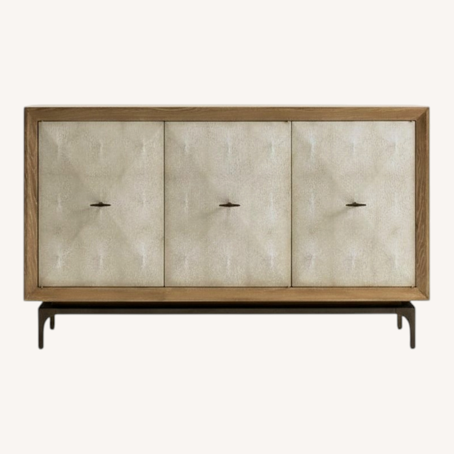 Seller's Notes:Art Deco style, 3-door media console/ storage cabinet featuring ivory faux shagreen panels with rubbed brass pull handles and dark bronze metal base. Original retail price $3200.