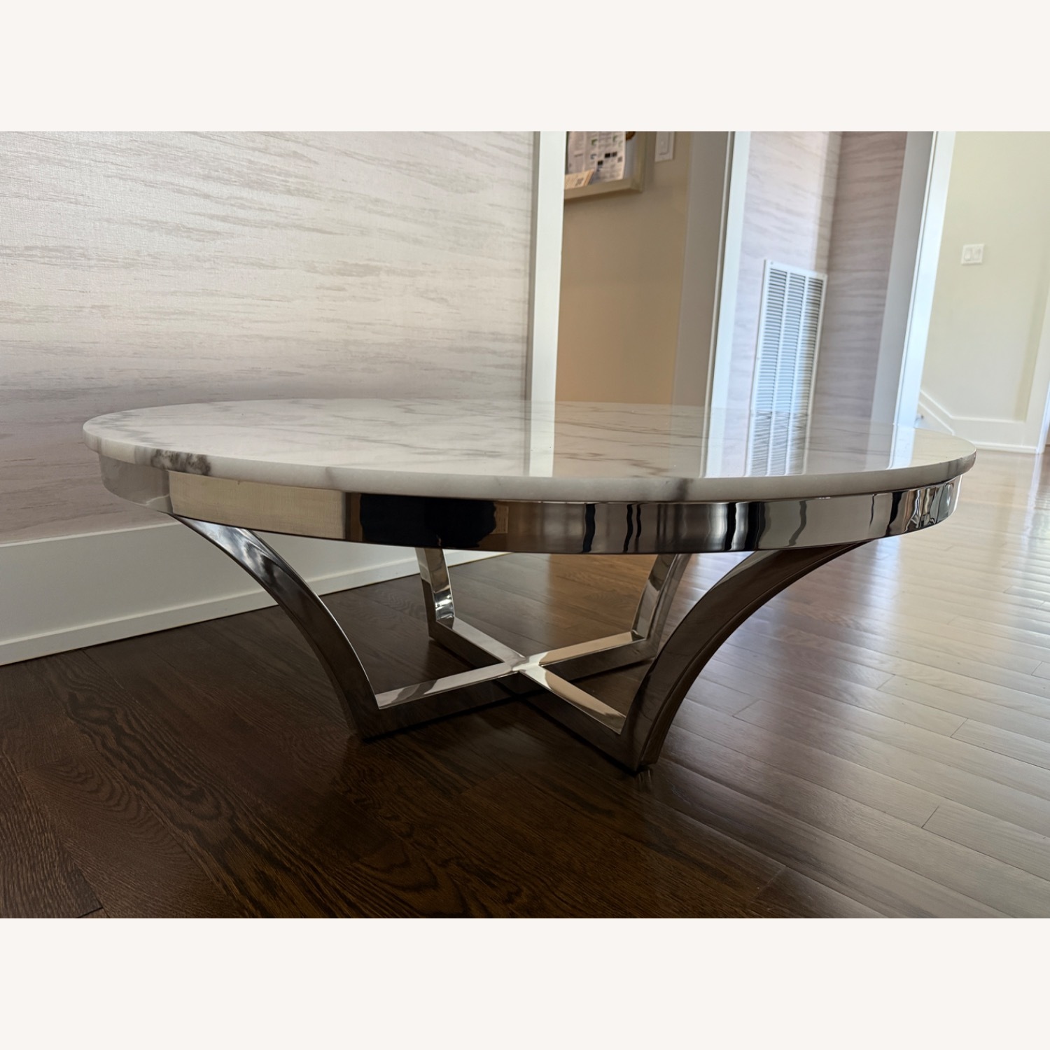 Seller's Notes:White marble top on silver metal base (the heavy top sits solidly on the base - they do not come attached). Only blemish is a few very small chips on side - not visible from top or side views as seen in photos.