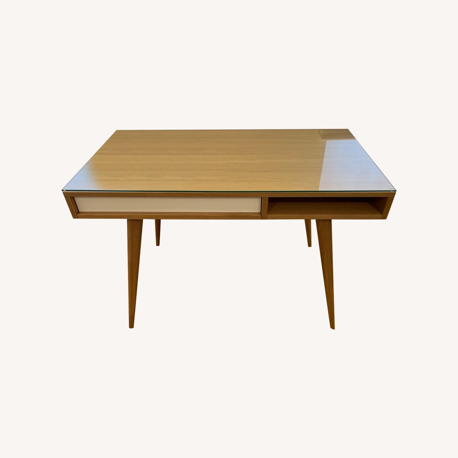 Seller's Notes:Design Within Reach Oak Desk with drawer and cubby. Has had a glass top since day one. Excellent condition too and desk.