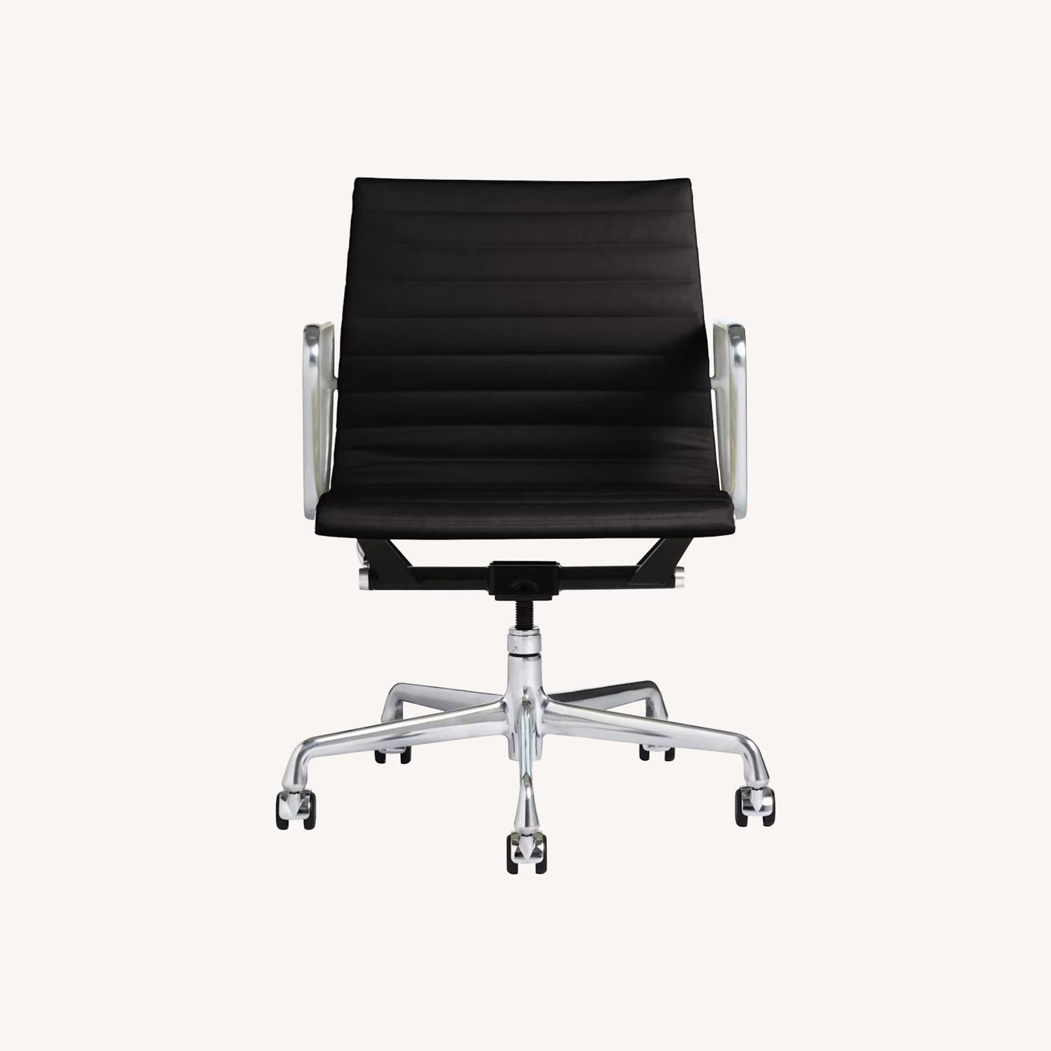 The Eames management chair is part of the Eames Aluminum Group Collection. These distinctive chairs resulted from the Eames's experimentation with aluminum, which became more affordable after WWII. Today, the management chair has aluminum side ribs that hold the one-piece, seat-back suspension taught to create a flexible "sitting pocket" that gently cradles you as you sit. And a pneumatic lift and swivel mechanism allow for personalized adjustment.