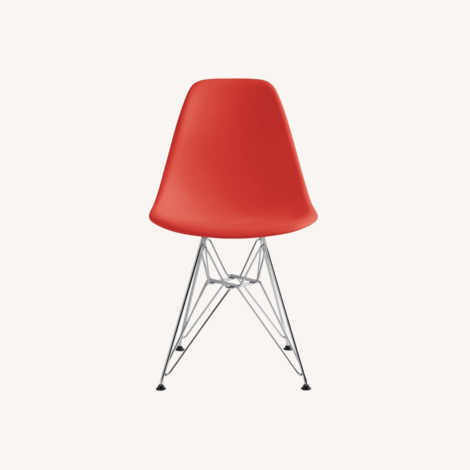 Seller's Notes:Eames molded plastic side chair in Red Orange. The base is Trivalent Chrome. The leg finish is Metal. They are in excellent condition. We moved and they no longer fit our dining room decor.