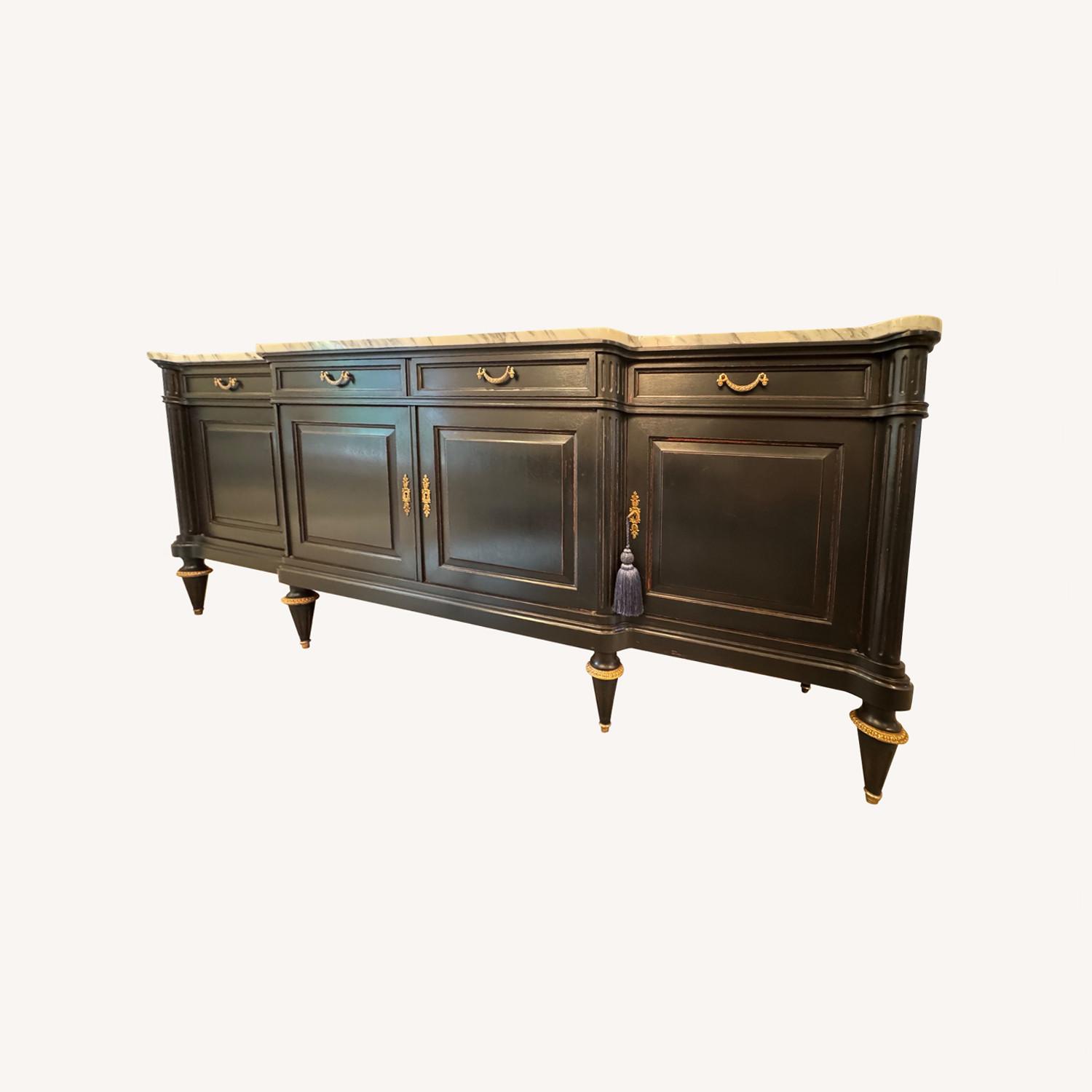 Seller's Notes:Antique mahogany sideboard, ebonized with white/grey marble top. Great condition with wear expected from an antique piece. Purchased from Antique dealer in Mississippi many years ago. Stunning antique piece—we have enjoyed in our dining room for years but it just doesn’t fit in our new home.