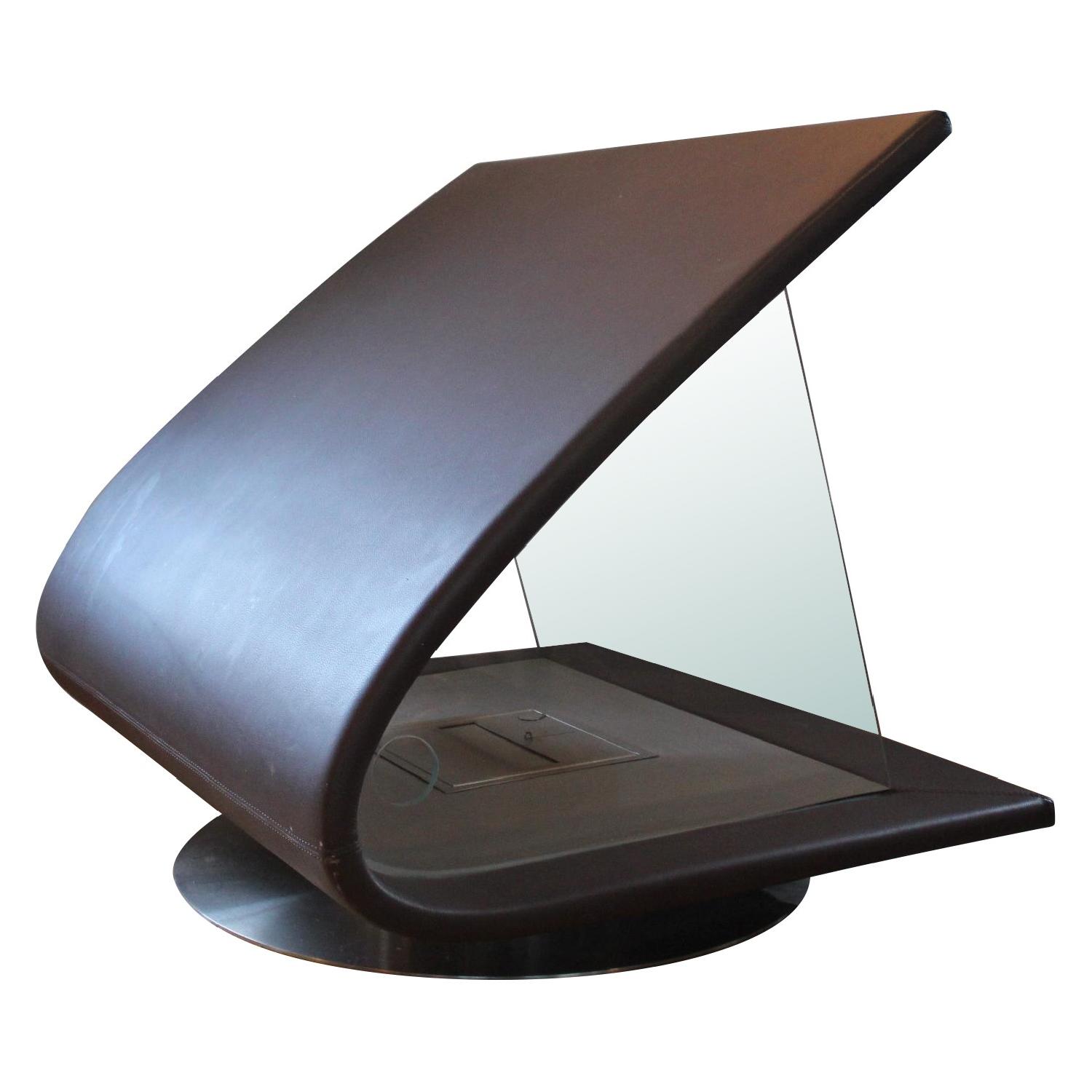 Seller's Notes:A clever fusion of timber, leather and stainless steel, the portable Zeta fireplace sits on a brushed or polished stainless steel swivel base. The plywood body of the fire is shaped from a high frequency heated aluminium mold into the perfect elliptical shape. A ventless stainless steel firebox insert is moulded to the internal face of the plywood, and the outer surface is upholstered in leather. The toughened glass screens that sit either side of the fire enhance the stunning visual effect created by the flame.