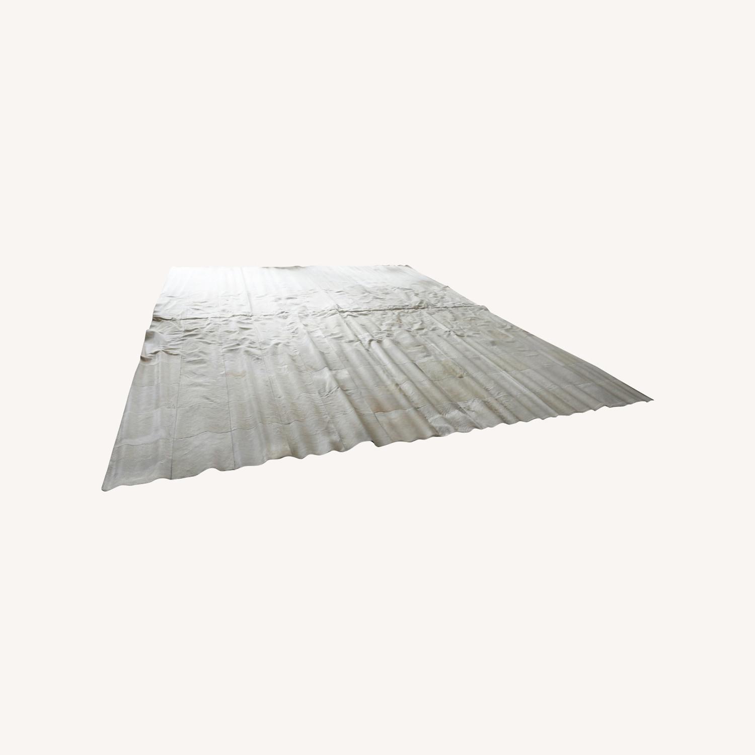 Seller's Notes:Bespoke Leather authentic Cowhide Edelman Leather Patchwork Cowhide Rug 12feet x 14 feet. Soft, varying natural color of cowhide, sewn together in patchwork pattern. Huge rug! Rare find. Never used. folded and rolled in same packaging it arrived in.