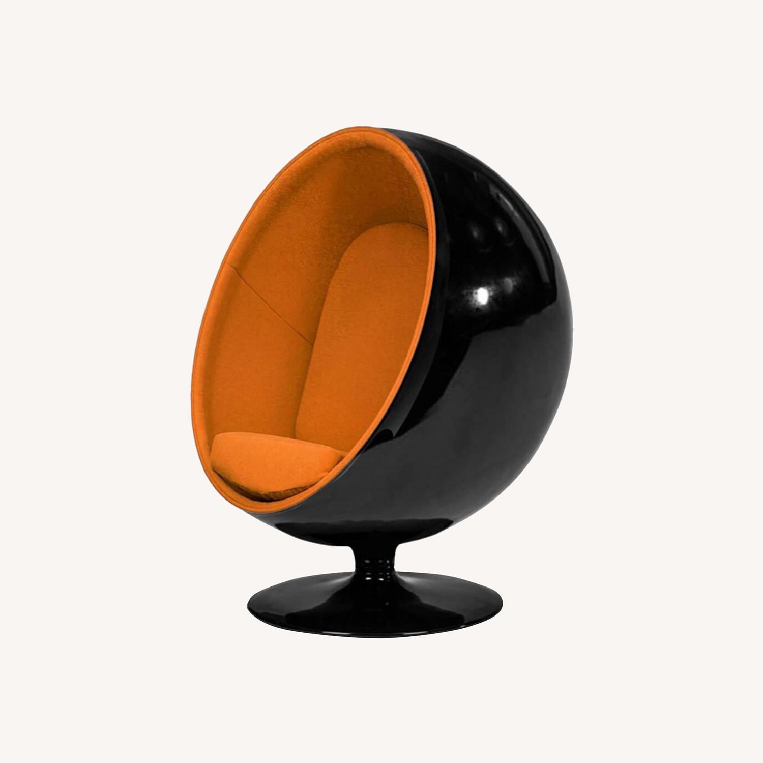 Seller's Notes:Inspired by Eero Aarnio's design from 1963, one of the most famous and beloved classics of Finnish design, made from fibreglass and upholstered with high quality fabrics. Black frame with orange upholstery and pillows. Frame has scuffing that can easily be touched up, tilts gently when sat in.