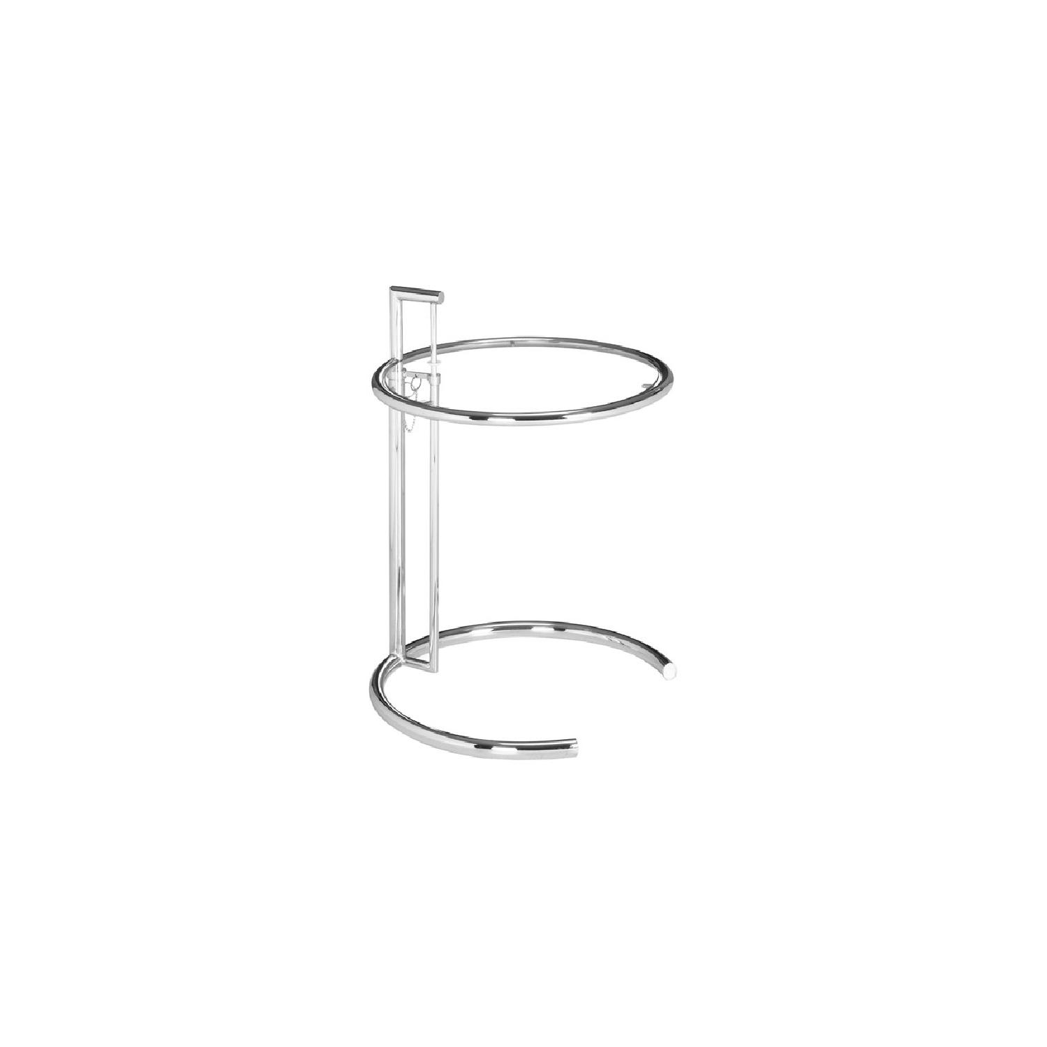 Seller's Notes:Eileen Gray designed the E.G Side Table in 1927 for use in her guest home at Roquebrune-Cap-Martin in southern France near Monaco. The tube steel design of the table is thought to have been inspired by designer Marcel Breuer. This replica Eileen Gray table has more to offer than just good looks. It was crafted with the purpose of both function and design. The table has an adjustable function that allows for the change in height. Originally used in Gray's home to serve breakfast bedside, you can picture it being used alongside many classic modern lounge chairs with its unique ability to adjust it up or down depending on the height need. diameter: 20” height: between 21” to 31”
