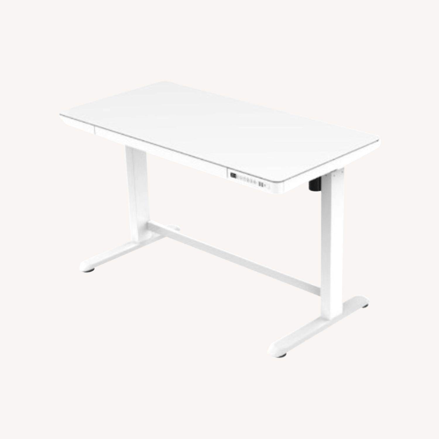 Seller's Notes:White Glass Tabletop Height adjustable from 72 cm to 121 cm (28.3 in. to 47.6 in.) 3 × 2.4 A USBs simultaneously power up to 3 devices at full speed 4 programmable height settings Lock and unlock the touch controls by pressing the button on the right-hand side Change from sit to stand easily with smooth operating, integrated motor Assembly required