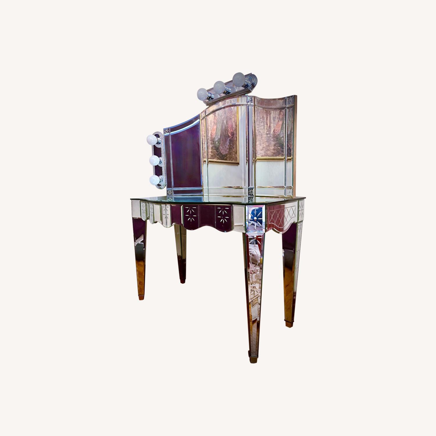 Seller's Notes:Gorgeous antique Vanity adds glamour and elegance to your space. It can be positioned as a dressing table or display piece for your treasures—sturdy, in exceptional condition, and unique. Capture and reflect light to brighten a space effectively and give the illusion of extra space. Outfitted with a trifold mirror for easy viewing of your sides and back as you dress. Comes with detachable bulb panels on both sides of the mirror and a top in the middle. Images show the left side of the mirror with the lights and the right side without the lights. Luxuriously fabric-lined drawers for makeup, jewelry, perfume, keepsakes, or secrets. Light foxing on the mirrors serves to demonstrate the pleasing patina of age. Our treasured family heirloom is ready to be your newfound favorite gem.