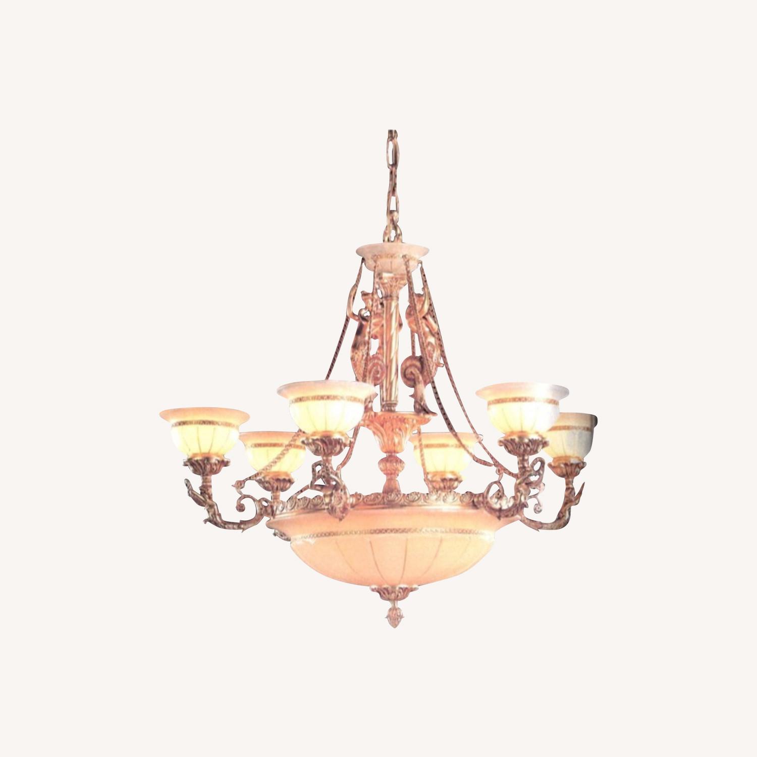 Seller's Notes:Fabulous chandelier, almost perfect condition. It was hung 6 years ago and we just took it down. Its a beautiful alabaster and umber finish. Solid brass chandelier with beautiful siren/mermaid figurines. Elegantly bolded float lamps.The center shaft is gorgeous with 3 sirens/mermaids. 6 lamps 40W Candelabra 6 lamps in bowl 40W The lighting from the chandelier is spectacular.
