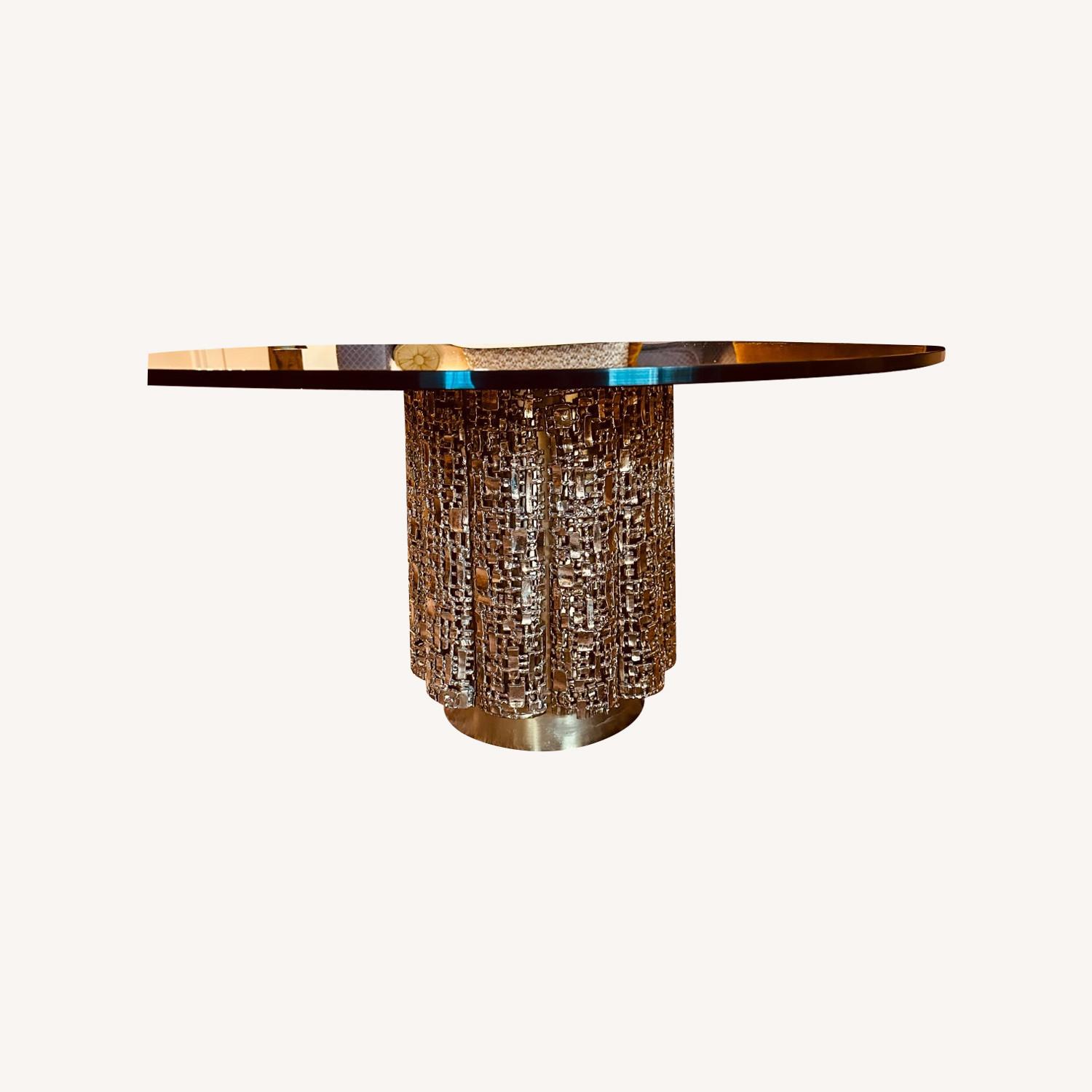 Seller's Notes:Concealed hinged door with a hidden compartment. Brushed brass pedestal base. Glass top is bronze and 36" round x 1/2" thick very sturdy glass. Could also accommodate a 42" round glass top if you want a larger table. The cylinder for the lock has been removed but can be restored. The clear glass top has been replaced with a better quality bronze, 1/2 inch thick, shatter resistant glass. There are minor scratches on the glass but it is bronze so they are not very visible. The pedestal is in good condition with moderate wear for the age of the piece.