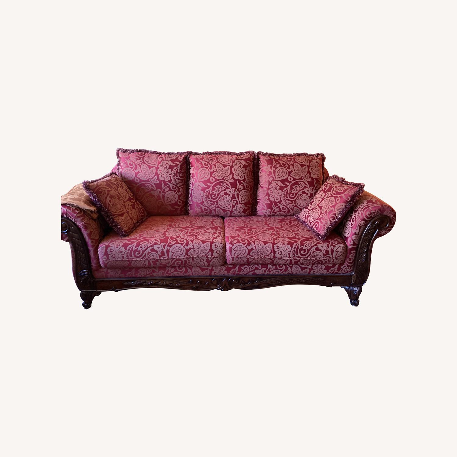 Seller's Notes:A striking red color (lucky for some). A nice durable heavy dark wood not pine. Subtle damask pattern All cushions removable.