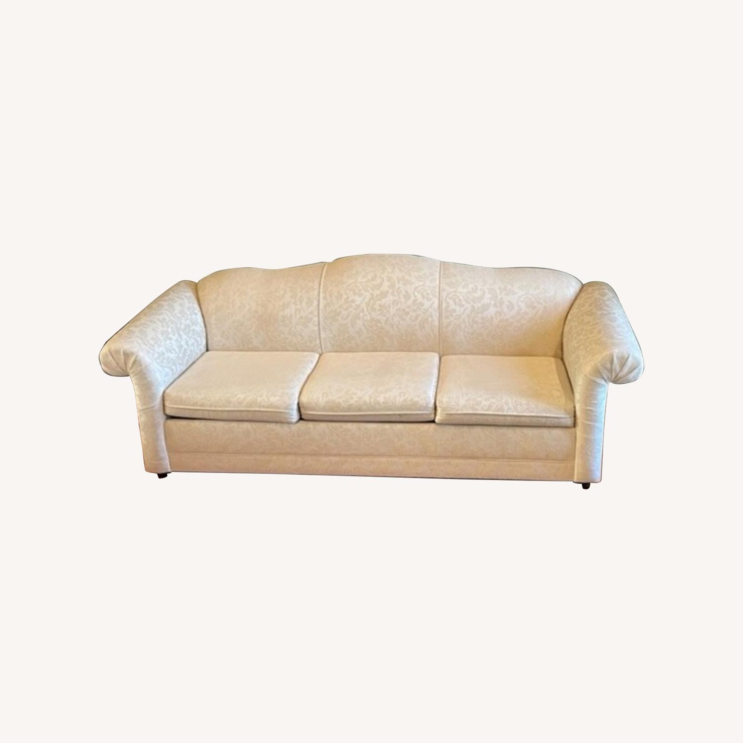 Seller's Notes:The ivory colored fabric of this sofa has a beautiful self-design. It is in excellent condition, and we also have a matching loveseat for sale. Originally purchased for $950, we are replacing this with a new one due to repainting of the room with a different wall color. Please note that the accent cushions are NOT included with the sofa.