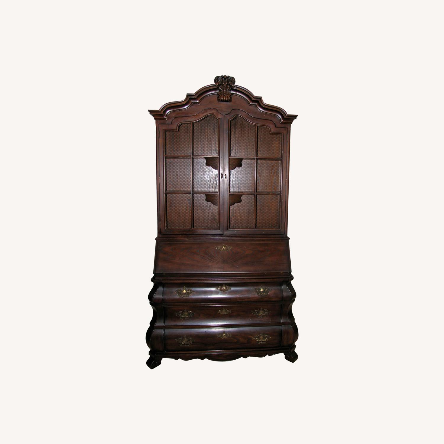 Seller's Notes:1 Secretariat Desk & Book Case – circa ‘50s.+, Looks New. Manufacturer; Heritage a division of Drexel Enterprises, Inc. Dimensions: 6 ½’ High, 3 ½’ Wide, 4 ½ wide at its base. Desk: 3 ½ wide, 16” deep, Fold out Door 9 ¾” Deep (total desk space; 16 ¾”), 6 cubby compartments: 2 – 3.5” x 10 ½”; 2 – 3 ½” x 9 ½”; 2 – 7” x 8.75”. Mid cubby compartment, 8” x 8.25”, 2 small drawers alongside 13” x 8” ea. Display Book Case – 3 Shelves, 3 ½’ wide x 7 ½” Deep, Has Hexagonal Wire Mesh Windows, and a functional Plug-in Interior light. Below desk are 3 large drawers 3 ½ Wide, 13 ¼” Deep. Contact Drexel Heritage Furnishings Inc.