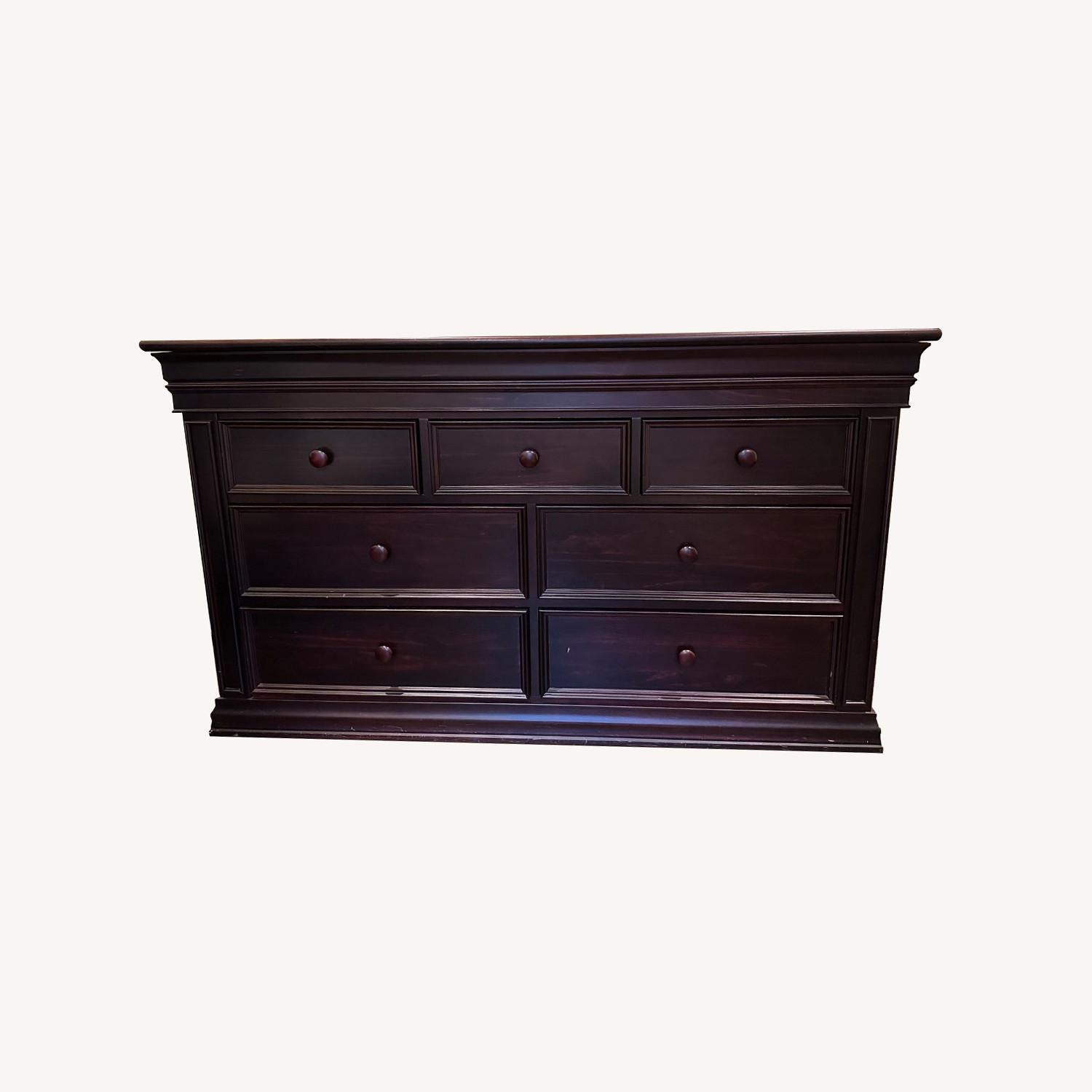 Seller's Notes:Elegant Solid Wood Dresser – Excellent Condition! Description: Espresso hued solid wood dresser features a beveled edge top with three top drawers and four bottom drawers, all with round wooden pulls and dovetail joint. Perfect for bedrooms, guest rooms, or even a sophisticated nursery setup. • Rich and elegant wood finish • 3 top drawers for accessories or smaller items • 4 large drawers for clothing and storage • Gently used and well-maintained • Smoke-free, pet-free home