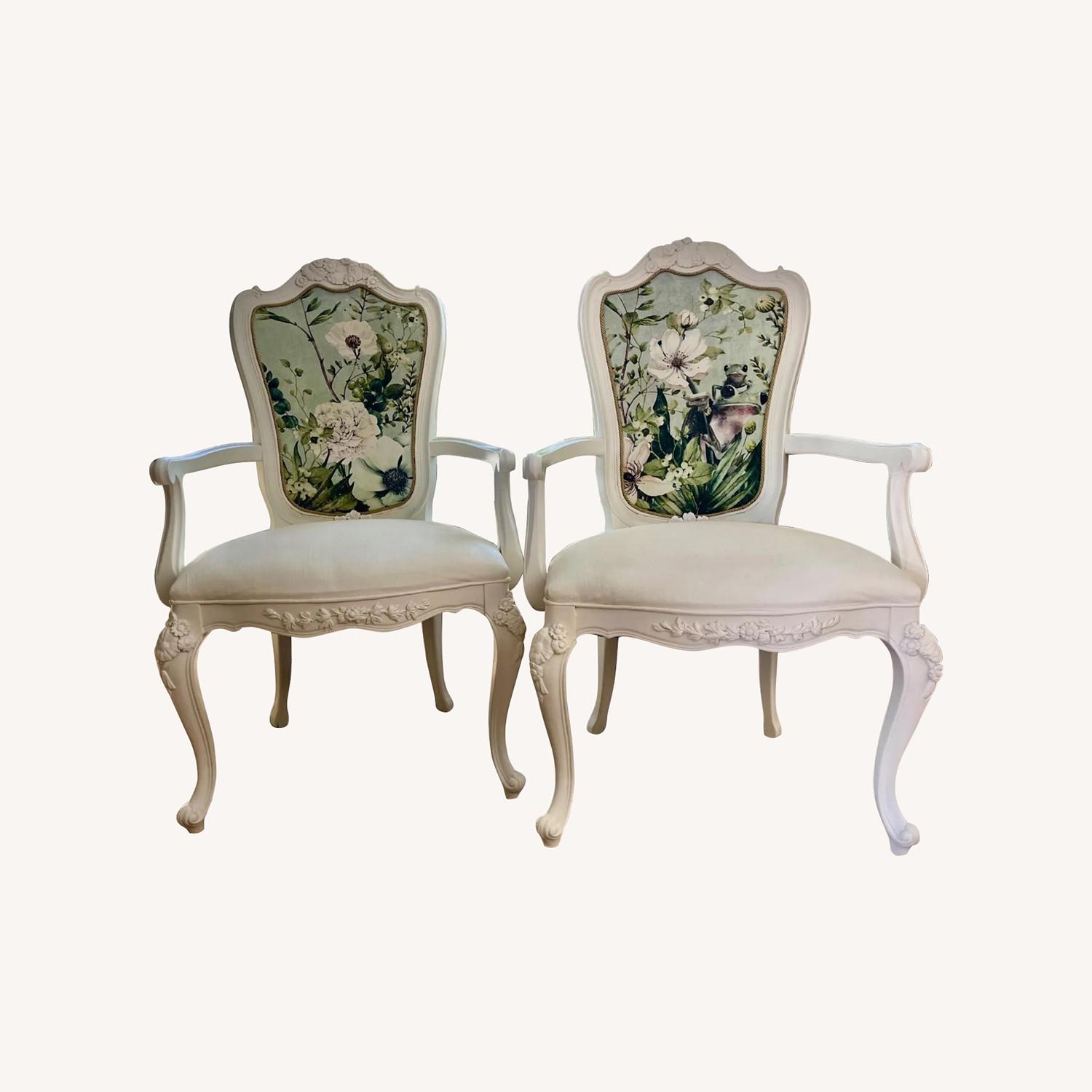 Seller's Notes:Transform your space with these enchanting vintage chairs. Meticulously restored and redesigned, these pieces exude timeless charm and romantic elegance. Delicate floral motifs adorn the seat and arms, creating a captivating vintage aesthetic. Enjoy the comfort of these chairs in any room in your home. These unique chairs are more than just furniture; they are a work of art that will add a touch grace, whimsy, and elegance to your home, office, or shop. Each Chair: Height: 36 inches Length: 28 inches Depth: 26 inches Our pieces are one-of-a-kind and cannot be replaced. Due to the nature of antique and vintage items, there may be blemishes, knicks, or other imperfections as expected with age and use. In our customization process, we aim to harmonize the present with the past, without completely obscuring its history. If you want more information about an item, such as additional images or condition, please inquire. CARE FOR FURNITURE: Dust with a soft dry rag. Never set anything wet or hot on your furniture.