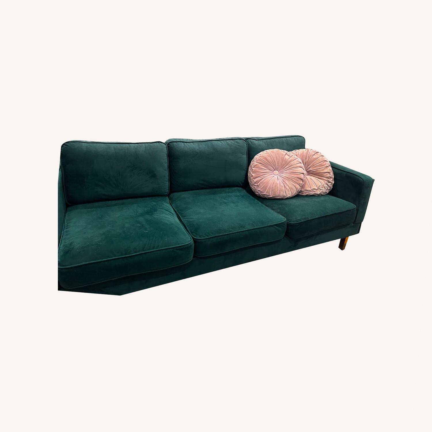 Seller's Notes:Two years old, super comfortable! Minor discoloration on back pillows. Emerald green with gold legs 32” H 87” L 34” D