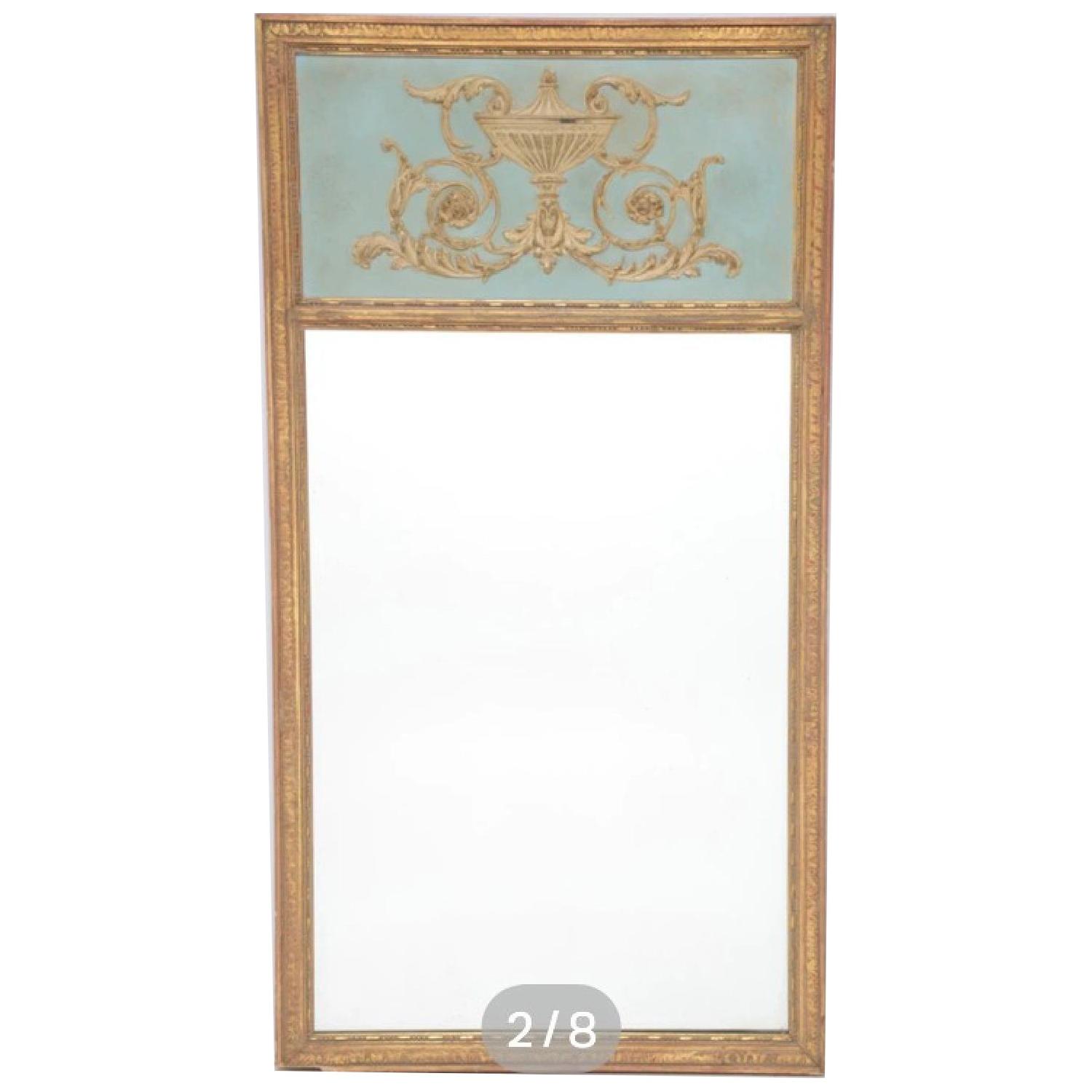 Seller's Notes:An Empire style wall mirror. This vintage piece features a columnar design with a top panel, finished in light blue and cream, with an applied urn and swag. The frame has a gilded finish with red undertones and is wired to the back for hanging. - Actual mirror itself is new and was replaced a few months ago. - This is an antique mirror, so there are obvious imperfections. The frame can be tightened to reduce the spaces in between the wood, but I wanted to show them to clarify expectations. measurements: 22.25" W x 42.25" H x 1.25" D