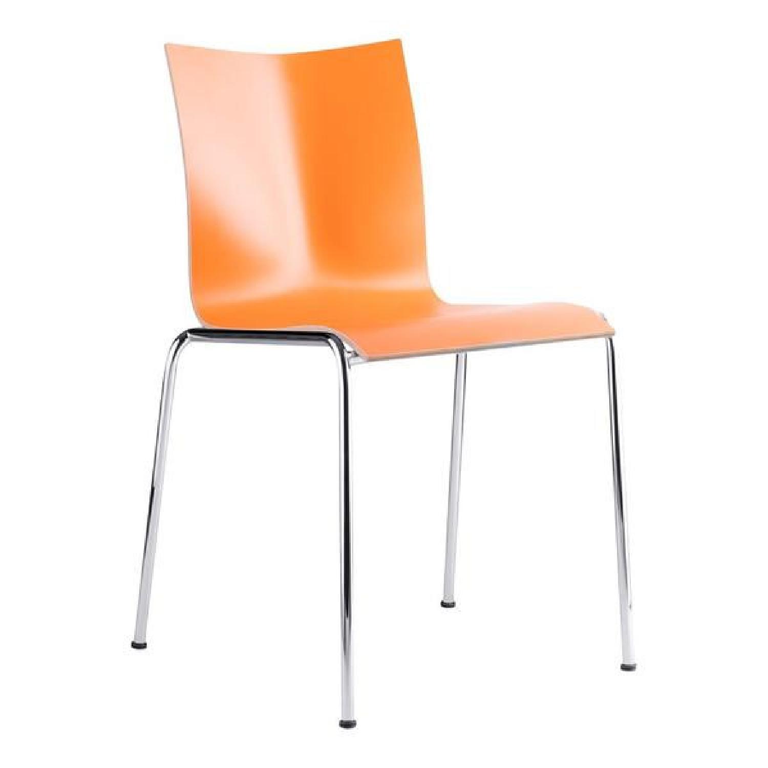 Seller's Notes:Perfectly designed, minimal chairs by Danish design company, Engelbrechts. They are loved, but barely used, so their condition is excellent. Molded melamine back is comfortable for the spine. Shiny chrome legs. Official Engelbrechts insignia and each chairs' serial number debossed on the bottom (see image). Stackable, sleek and cheerfully colored! Also available: 2 identical chairs in pastel blue.