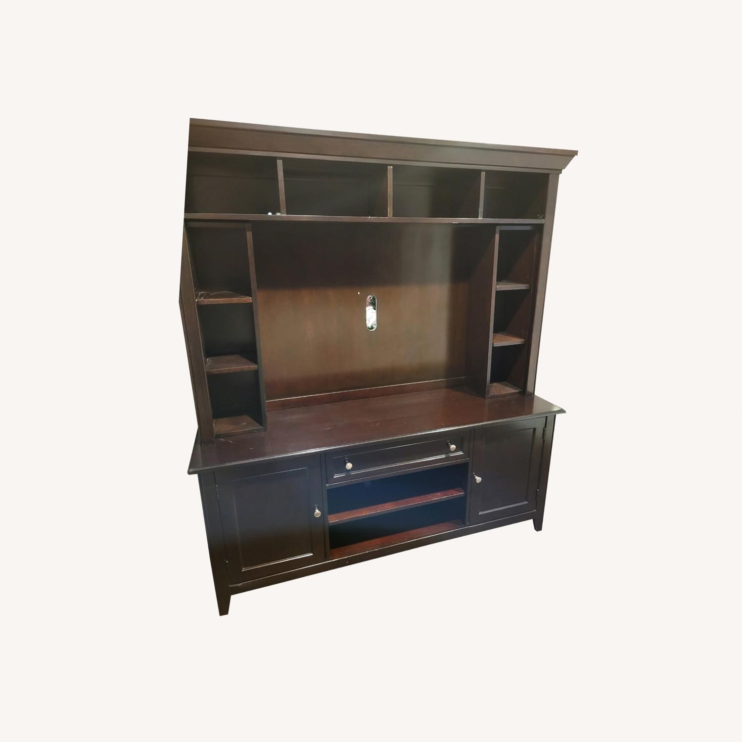 Seller's Notes:Beautiful dark wood entertainment center. Holds up to 75" tv. The upper half comes off as well as the side storage shelves. In great condition. Its a timeless looking piece that will blend with any style. Lots of storage and is very stong and well made compared to what I see in stores today. Wish I had another room to store it.
