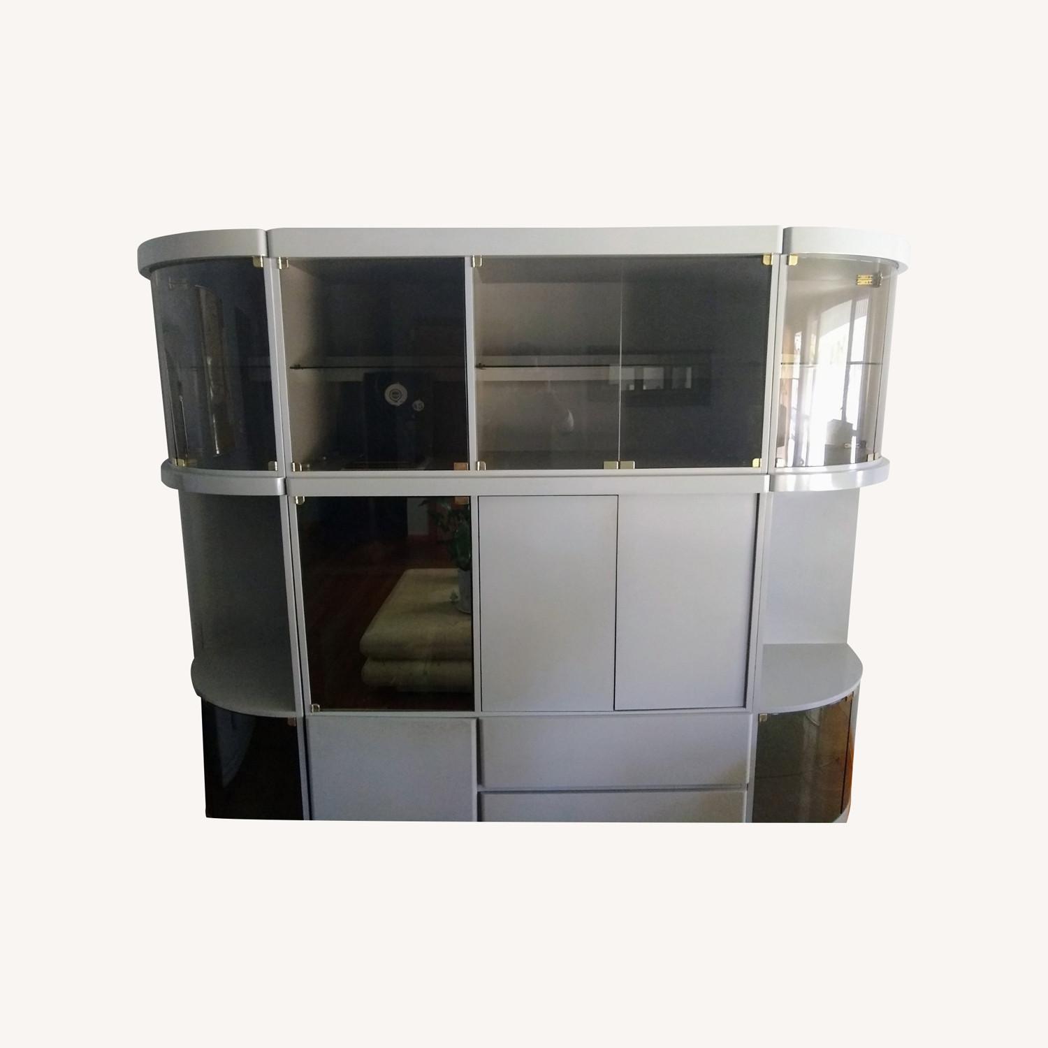 Seller's Notes:Entertainment Center with glass doors, multiple storage cabinets/drawers, six display areas for photos, plaques, awards, etc; main center unit has a pull out area for access to television and other other electronic devices. Center doors slide back. This storage piece is 117 inches in Length, 21 inches in Width, and 78 inches in Height. Comes in three sections (left, center, right). Perfect for living room area, entertaining guests and family, or even showing off special moments in your life. My family has spent decades enjoying this entertainment center to the fullest and are currently remodeling some spaces in the home. We would like another family to enjoy this piece as well like we did. Contact me to negotiate a price or if you have any other inquires.