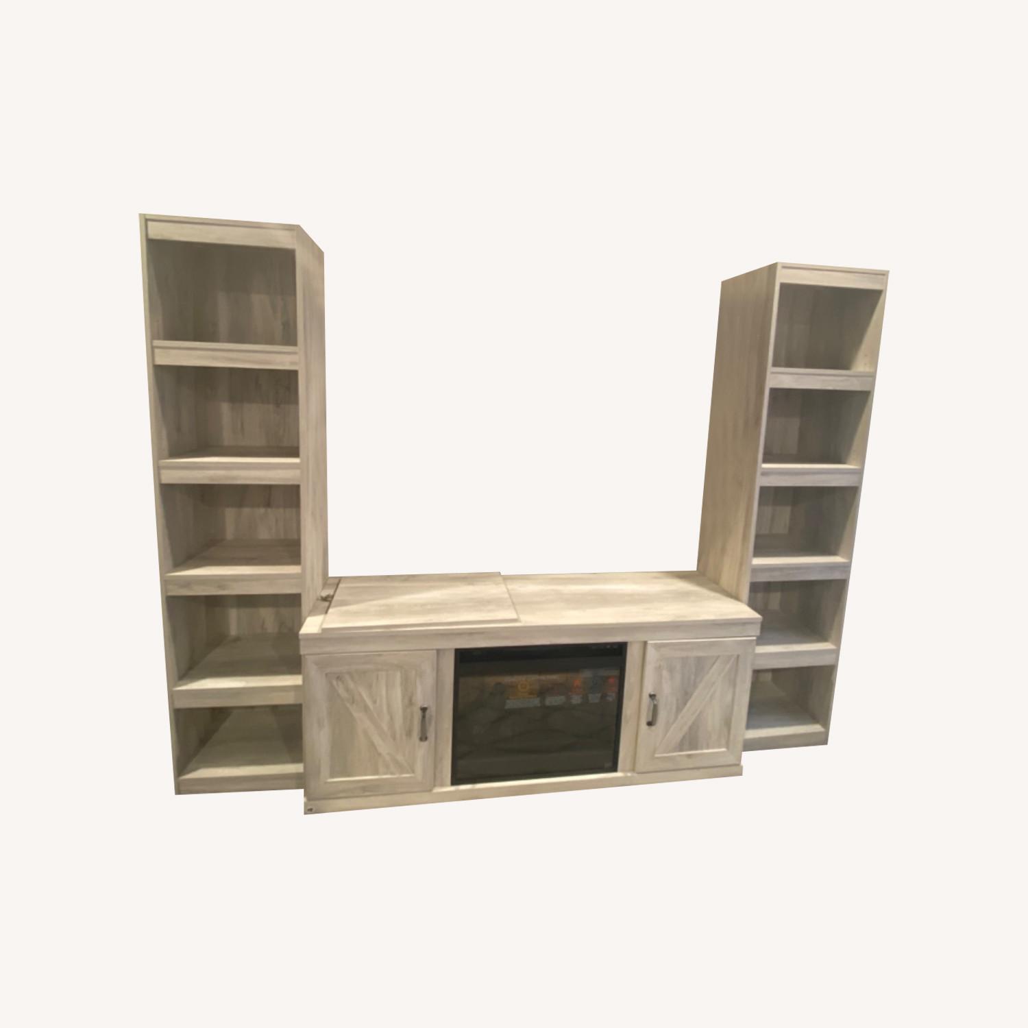 Seller's Notes:60” TV Stand with working electric fireplace Two 4-shelf piers *TV, sound bar, coffee table & couches not included but listed separately if interested*