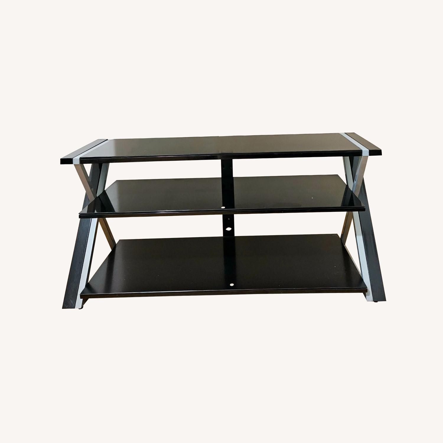 Seller's Notes:Black and silver tv mount. ( tv not included ) Has 3 shelves to store your consoles, decorations and anything your heart desires. It's a great piece and can elevate any space.